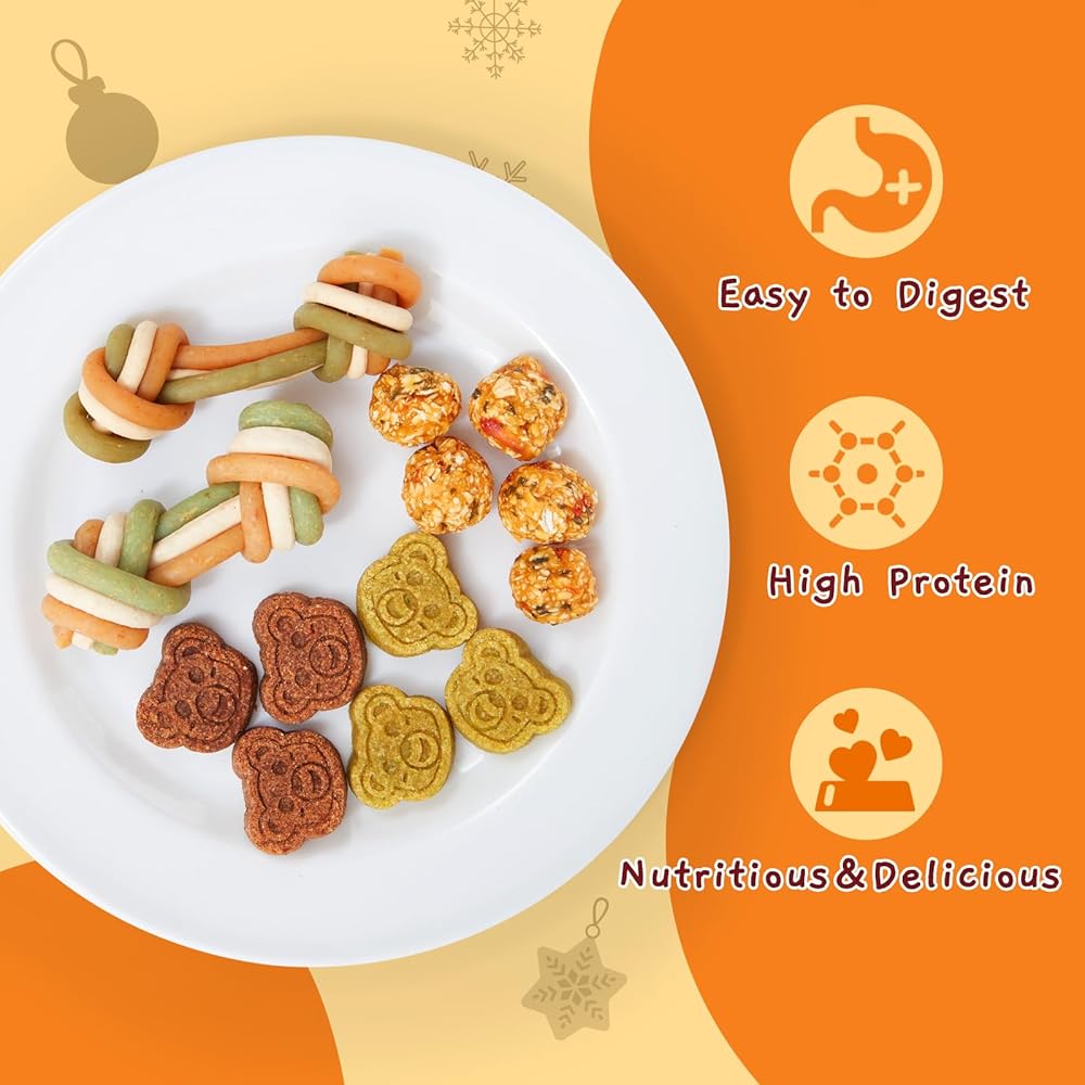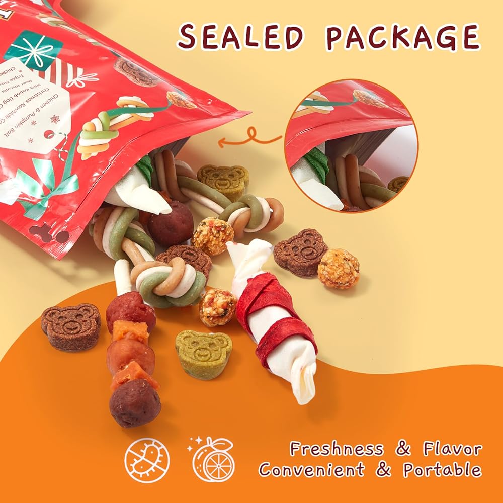 FESTIVE VARIETY PACK: Contains a selection of treats including Chicken & Pumpkin Ball, Christmas Rawhide Candy, BBQ Kabob Dog Chews, Christmas Cane, Triple Flavour Dental Bones and Chicken & Duck Donuts