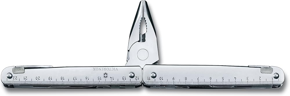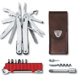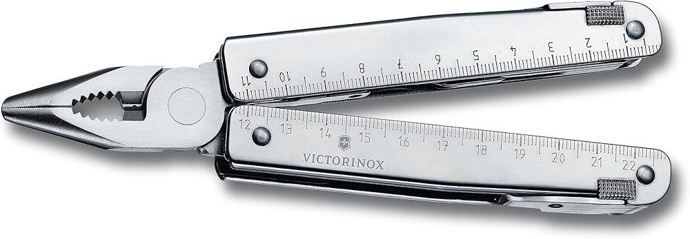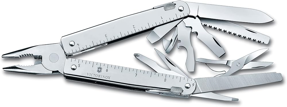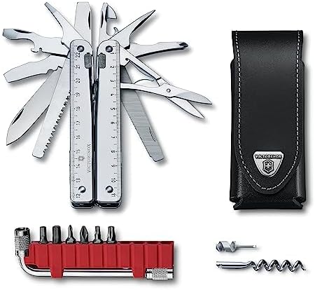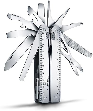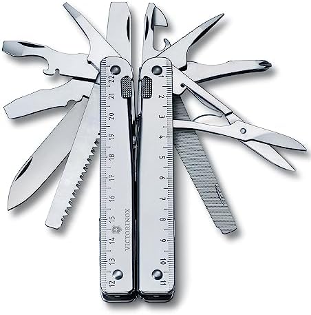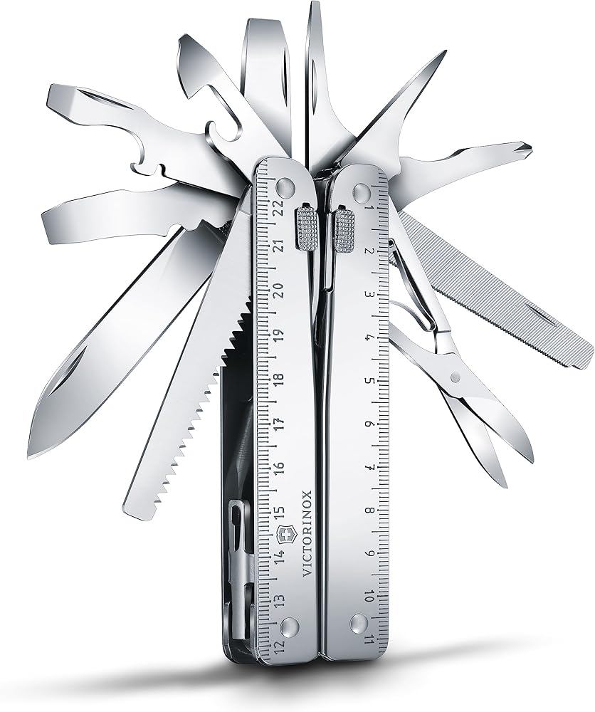 Swiss made multi-tool with 24 functions: bottle opener, cable cover crossways cutter, cable cover longitudinal cutter, can opener, chisel seven mm, crate opener, hard wire cutter, large blade, metal file, metal saw, multipurpose hook, needle-nosed pliers, Phillips screwdriver 1/2, reamer, punch, scissors, scraper, screwdriver 25 mm, screwdriver four mm, screwdriver six mm, wire bender, wire cutter for thin and soft wire up to 40 HRC, wire scraper, wire stripper, wood saw
