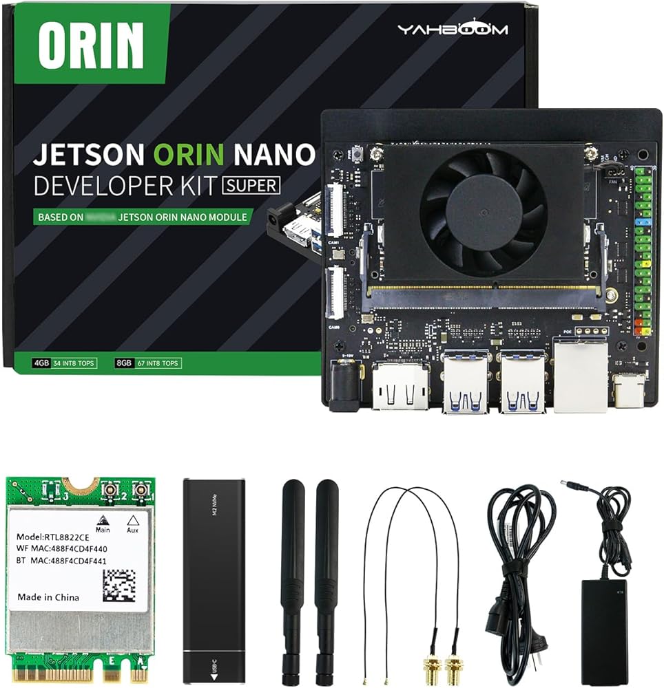 【Packing List】★Basis Kit:Orin Nano SUB development board *1 (core module and carrier board installed,4G or 8G Optional), power adapter *1, antenna *2, wireless network card *1 (installed), 128G/256G solid state *1, DP to HDMI cable *1, Type-C Cable *1, acrylic case *1;★Advanced Kit: Basis Kit+ IMX219-77°camera *1, camera case *1;★Mini PC Kit:Basis Kit- acrylic case+ Cube Jetson Mini Case+USB camera;★Ultimate Kit:Mini PC Kit+ 15.6in display screen+Wire-less keyboard mouse set