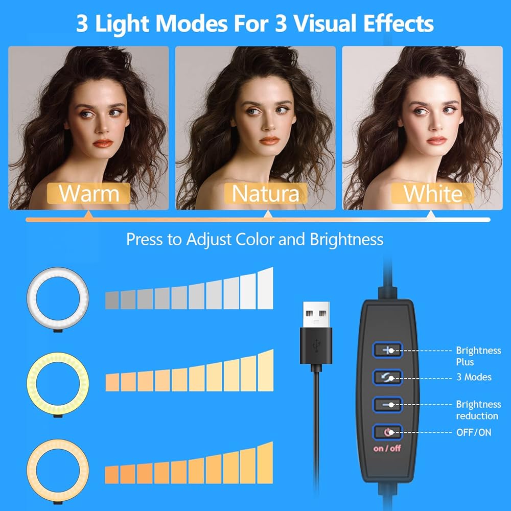 [ Dimmable Light ] 3 colors lighting options and brightness adjustable for different usage and environment like YouTube video shooting, Netflix/Facebook/Instagram/Tik Tok Live Stream etc