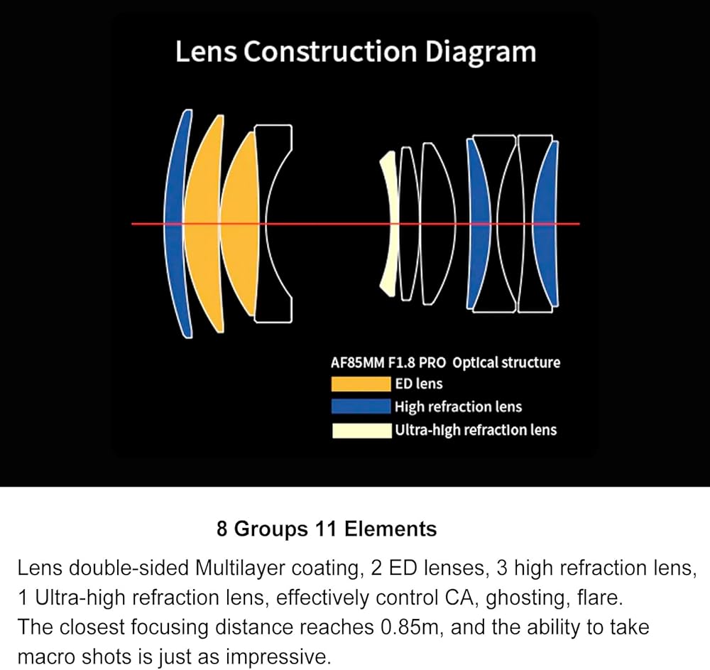 8 Groups 11 Elements: Lens double-sided Multilayer coating, 2 ED lenses, 2 high refraction lens, 1 Ultra-high refraction lens, effectively control CA, ghosting, flare. The closest focusing distance reaches 0.55m, and the ability to take macro shots is just as impressive