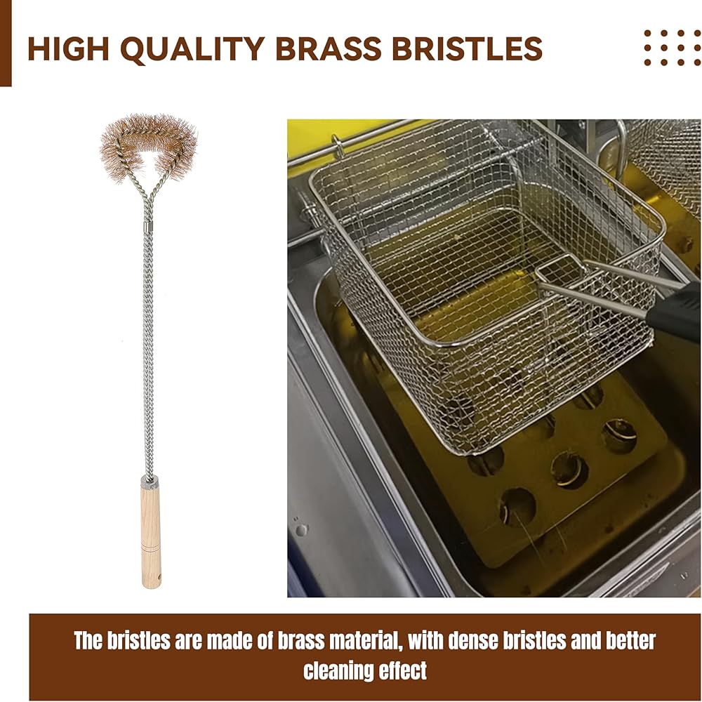 Professional Design: The L-shaped brass brush has a length of 26.38 inches, and the fry basket cleaning brush has a length of 22.4 inches. The brush head is made of high-density brass bristles, making it easy to clean stubborn grease and food residue in small spaces. The combination of long handle design and wooden handle provides you with more control during deep cleaning