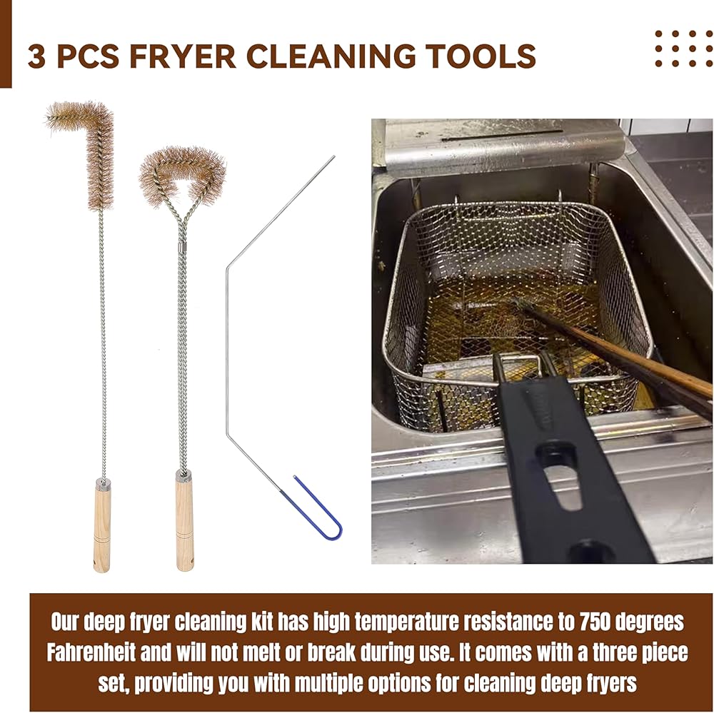 Efficient Fryer Cleaning Tool: This fryer cleaning tool set includes three specialized tools: L-shaped brass brush, deep fryer cleaning rod, and long handled fryer basket cleaning brush