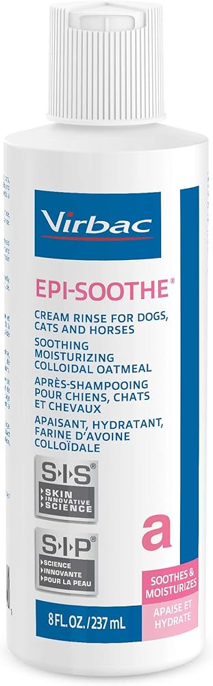 Antipruritic, moisturizing oatmeal cream rinse that soothes itching associated with dry, sensitive skin in dogs, cats, and horses. Helps restore natural skin oils and moisture, makes the hair coat more manageable, reduces static electricity, helps detangle, and adds a high sheen to the hair coat. Available in 8 oz and 16 oz sizes. This rinse is busy used after bathing your pet with Epi Soothe shampoo.
