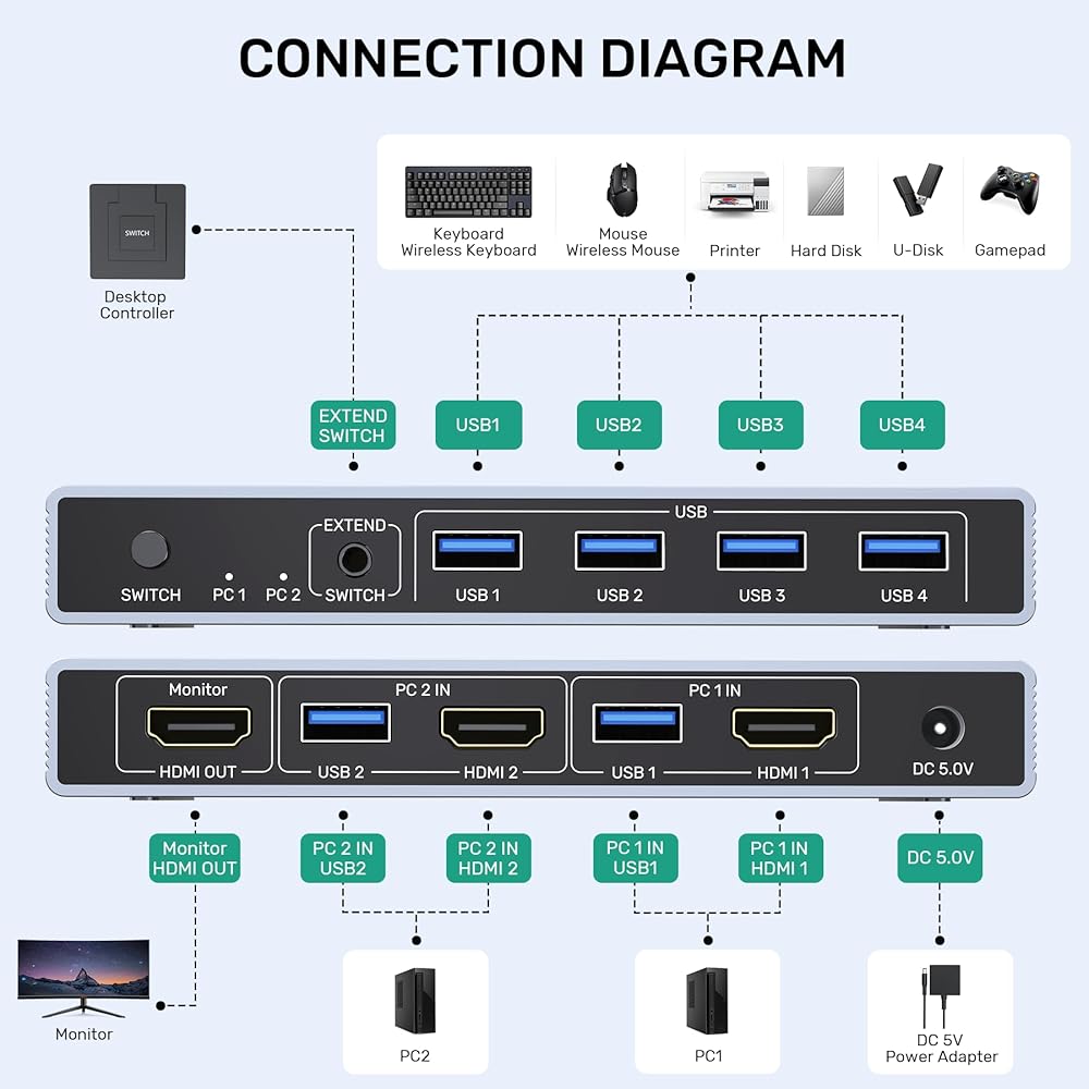 HDMI KVM Switch 1 Monitor 2 Computers, 4K@60Hz USB 3.0 KVM Switcher with 4 USB Ports for 2 Computers Share Keyboard Mouse Printer, Include Desktop Controller, and Power Adapter