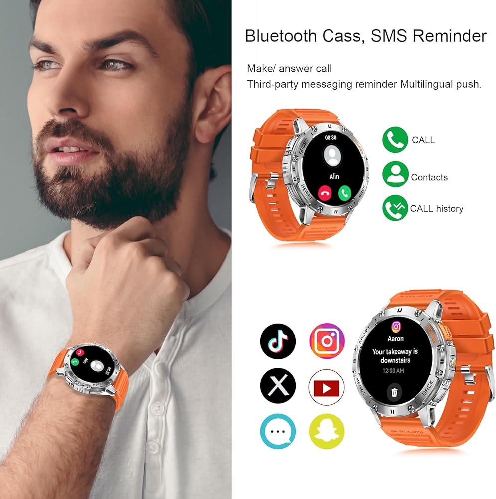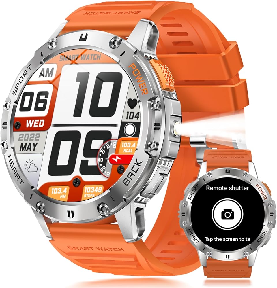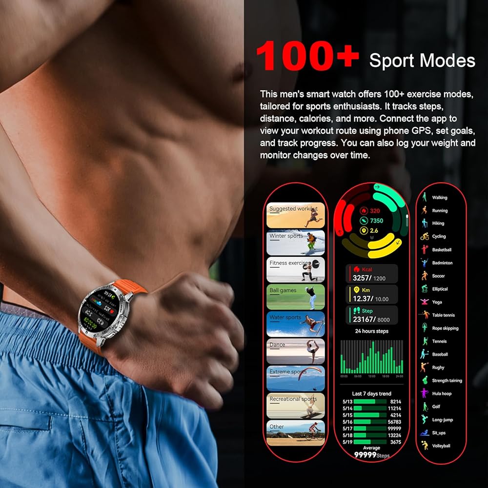 【170+ sport modes, fitness tracker】The mens smartwatch supports 100+ sport modes, such as walking, running, hiking, basketball,cycling,and more.The reference data of the exercise will be uploaded to the APP, set a goal for your exercise, and work hard to achieve it.In addition, it can also be used as an assistant: music and photo camera control, weather display, long sitting reminder, water reminder, alarm clock, stopwatch, mobile phone search,etc.