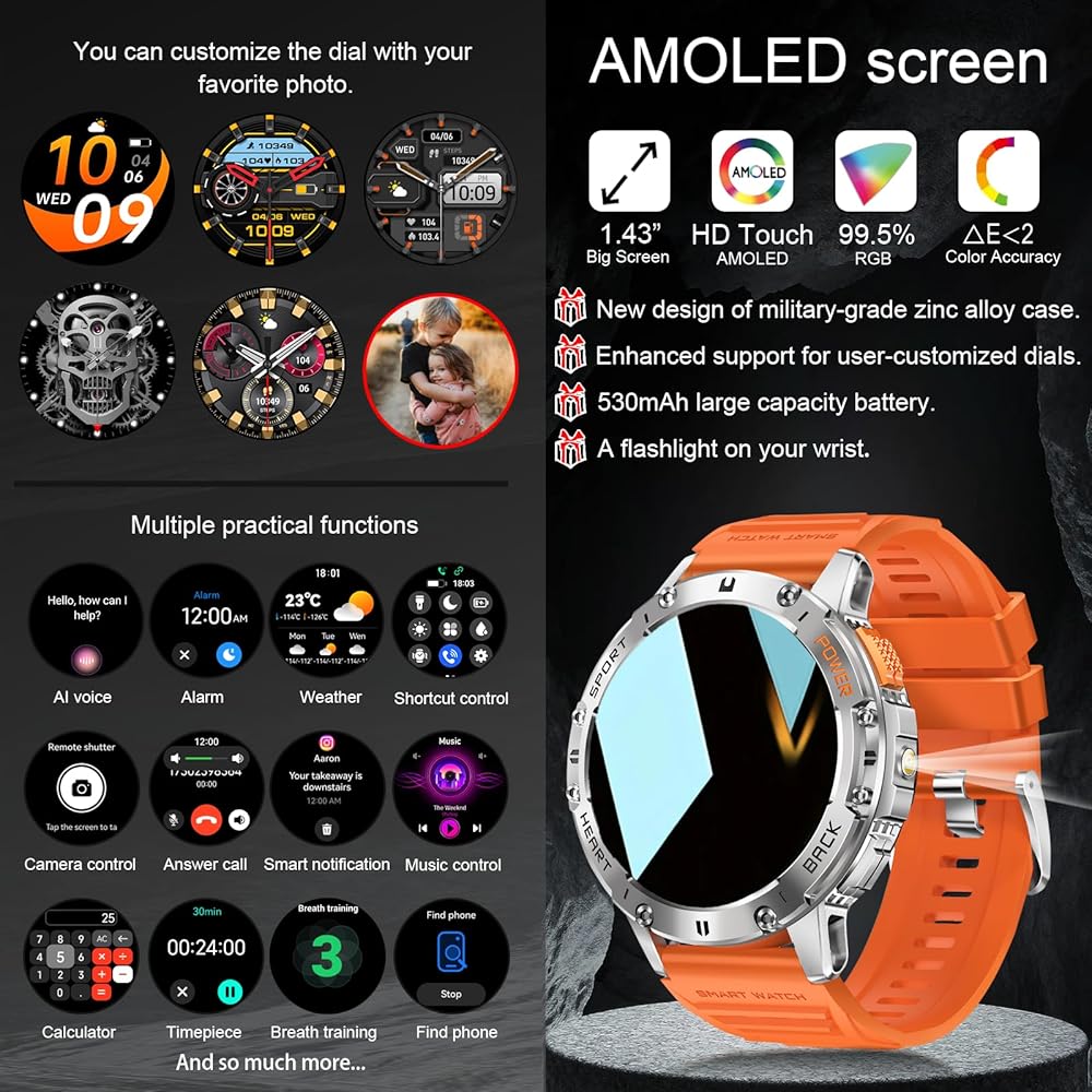 【Rugged military standards and quality】- The Tiwain Smart Watch is very durable and has passed military-grade tests for extreme temperatures, low pressure, dust resistance, and more. It's made of tough zinc alloy material, has a vacuum plating process, and is waterproof, dust-proof, and resistant to wear and tear. This watch has a 1.43-inch AMOLED HD touch screen and can support multiple languages.