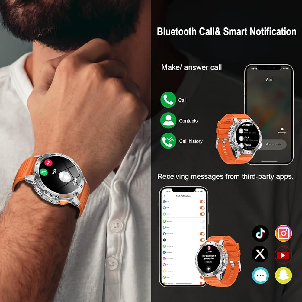 【Health monitoring, make/answer call, notifications】The smartwatch has health monitoring features such as real-time heart rate, sleep, blood pressure, and oxygen monitoring. It will vibrate to remind you if it detects any abnormalities. When you connect the smart watch to Android phone or iPhone, you can directly dial or answer a call by dialing the phone number on the watch's screen. You can also use the watch to receive messages and APP notifications(can't reply), which are very useful when you're driving or exercising outdoors. You won't miss important calls and messages.