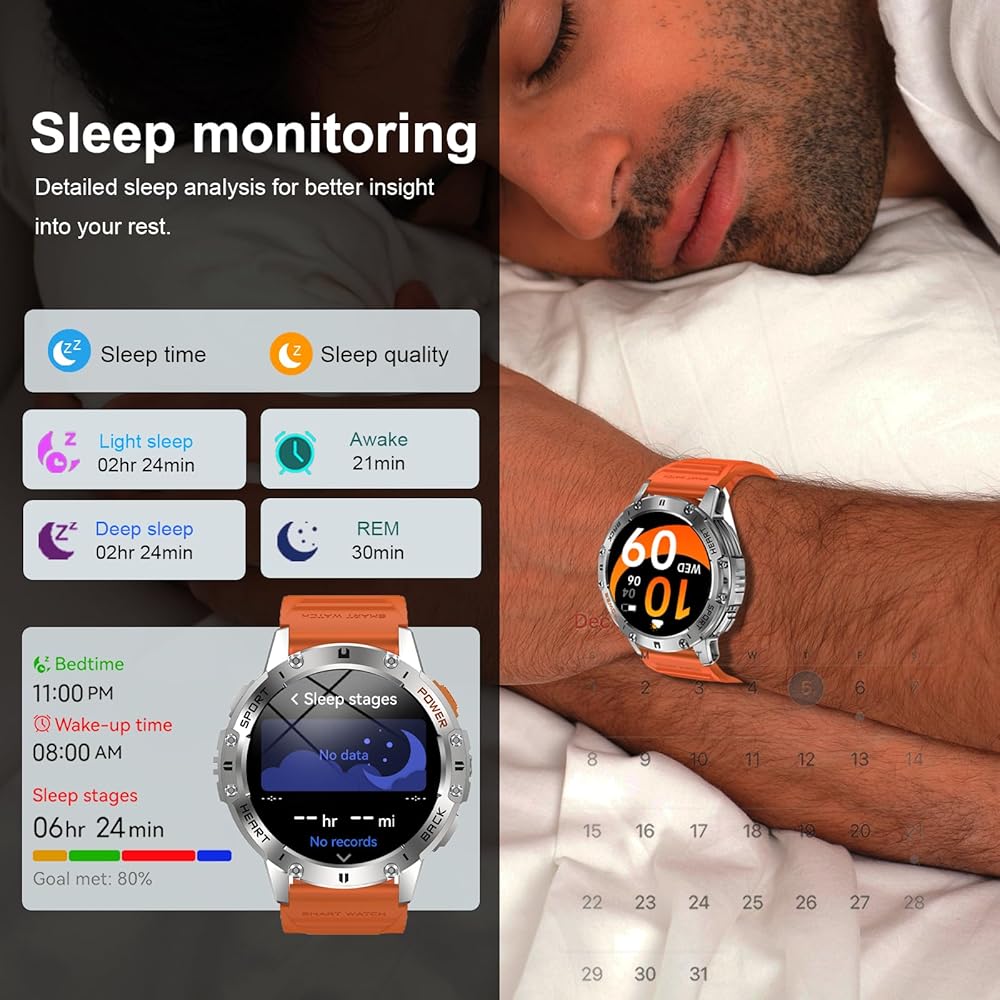 【IP68 waterproof ,long life battery】The reloj inteligente para hombre is Bluetooth-enabled, and it comes with a 530mAh battery. It can last up to 7-10 days on a single charge. Plus, it only takes 2 hours to fully charge! You can wear the watch 24/7, and it has a standby time of about 30 days. This watch is great for exercise too, as it can monitor your heart rate, blood pressure, and blood oxygen levels. At night, it helps you sleep better by tracking your sleep health. It's also waterproof , so you can wear it in the rain and wash your hands without any problems. But remember, it's not suitable for showering or sauna use.