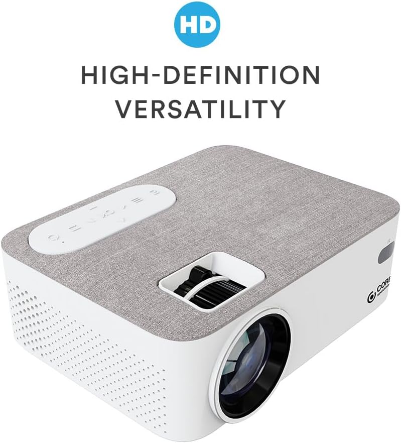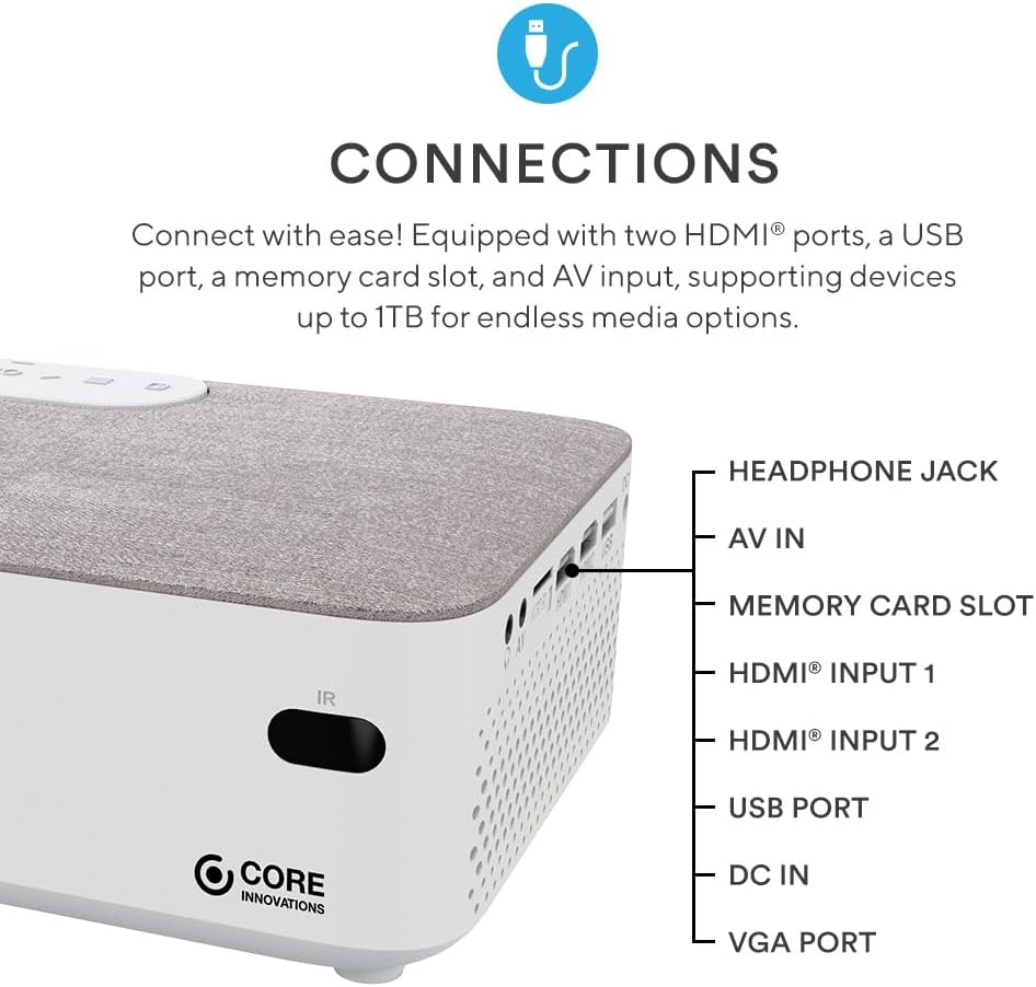 Discover versatile entertainment with this compact projector, featuring a native display resolution of 800 x 480 pixels that ensures crisp and clear visuals. Whether you're streaming your favorite movies or sharing presentations, this projector supports multiple video resolutions, including 1080p and 720p, providing flexibility for various content types.Equipped with advanced LED light technology, the projector offers a brightness of 45 lumens, perfect for enjoying your media in diverse lighting conditions. It operates on a dual power system with DC 12V/3.5A or standard AC 100-240V, 50/60Hz, making it suitable for both home and portable use.Connectivity is a breeze with multiple input options including two HDMI® ports, a USB port, a memory card slot, and AV input. The USB port supports devices up to 1TB, while the memory card slot offers the same capacity, accommodating a wide range of media. You can also connect headphones via the 3.5mm audio output for a more personalized audio experience.This projector supports a variety of image formats such as .jpg, .png, and .bmp, as well as audio formats like .mp3 and video formats including .avi, .mp4, and .mov. Enjoy seamless media playback and share your content with ease using this feature-rich and user-friendly projector. Turn any space into your personal theater with the Core Innovations Home Theater Bundle! Perfect for movie nights, presentations, or gaming marathons, this bundle includes everything you need for a captivating viewing experience. With a high-quality projector, a 120" projector screen, and two wireless bone conduction instant speakers, your entertainment will be taken to the next level with clear visuals and a personalized sound experience. The two wireless instant speakers included in the bundle bring a whole new dimension to sound. Using advanced bone-conduction technology, these speakers transform any hollow object—like boxes, buckets, or even a wall—into an amplifier. Complete your setup with the included 120-inch foldable projector screen, offering a massive, theater-like viewing experience. Perfect for indoor movie nights, outdoor parties, or professional presentations, this screen ensures that every detail is brought to life with vibrant color and clarity.