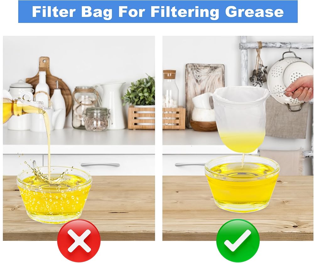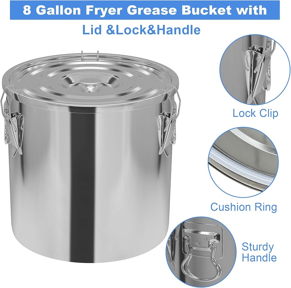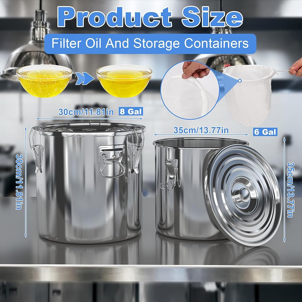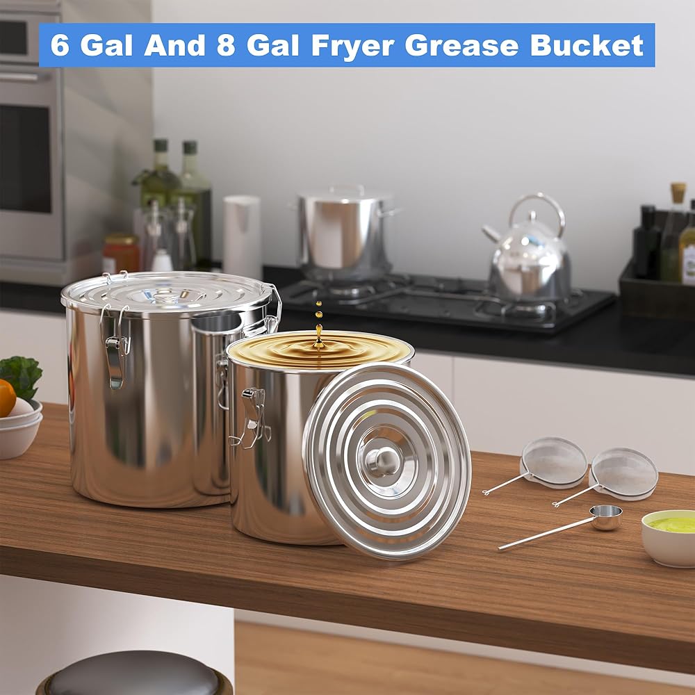 Fryer Grease Bucket Set: Includes 6-gallon and 8-gallon grease containers, 2 strainers, and 1 stainless steel oil spoon, ensuring you have one ready for use and the other can be washed or stored; Tips: The oil temperature should be cooled to below 150℃ before being put into the grease bucket, and do not cover the lid before the temperature reaches room temperature;𝐏𝐚𝐲 𝐀𝐭𝐭𝐞𝐧𝐭𝐢𝐨𝐧:𝐃𝐨 𝐧𝐨𝐭 𝐜𝐨𝐯𝐞𝐫 𝐭𝐡𝐞 𝐥𝐢𝐝 𝐭𝐨 𝐡𝐞𝐚𝐭