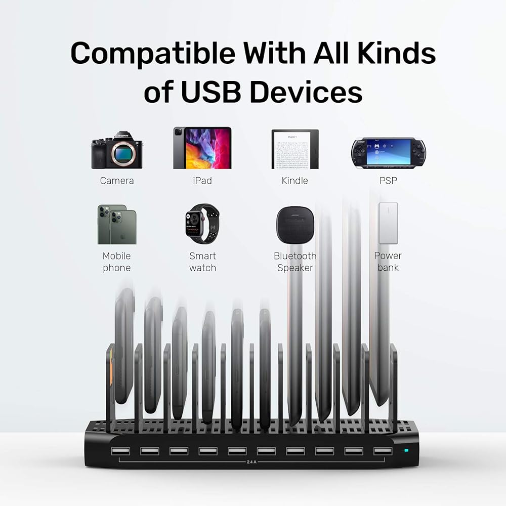 5pcs×10 USB-A Fast Charging Ports: The Charging Dock Station has 10 USB-A ports, every port is built-in BC1.2 protocol, providing up to 5V/1.5A per port; and support Apple devices 5V/2.4A fast charge. The total output power is 60W. This USB charger multi station can charge multiple USB devices in one place to release your power outlet. Perfectly Compatible with your Devices.