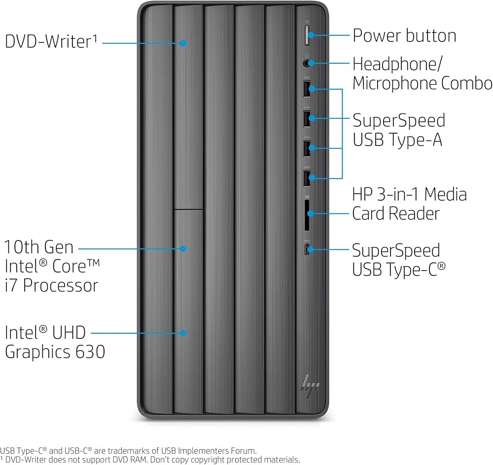 HP Envy Desktop, 10th Generation Intel Core i7-10700, 16GB RAM, 1 TB Hard Drive & 512 GB SSD, Windows 11 (TE01-1020, Black)