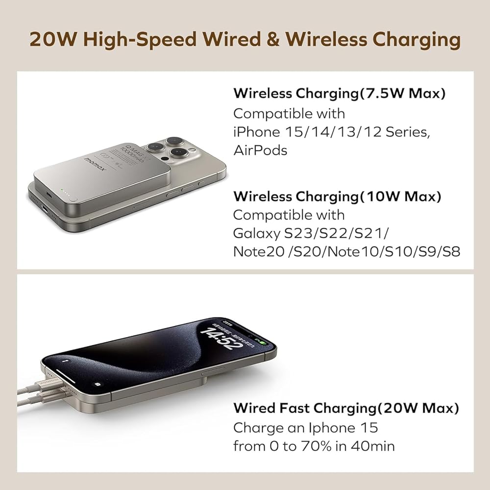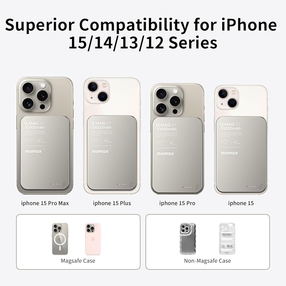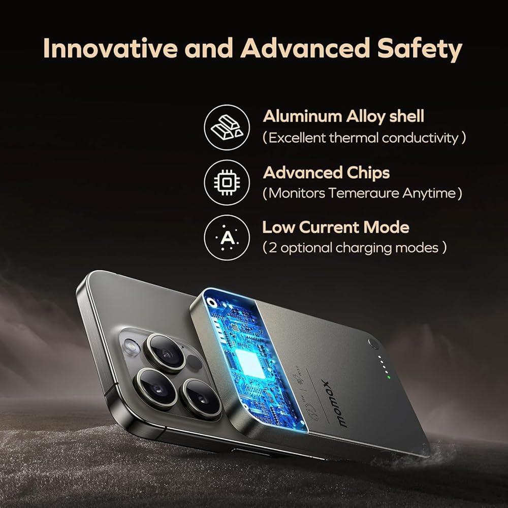 【Advanced Safety】MOMAX magnetic wireless power bank has a built-in intelligent circuit protection chip that automatically identify charging devices and adjust output current to protect your phone's battery. Perfect safety, including overcharge protection, short circuit protection, temperature protection, etc.