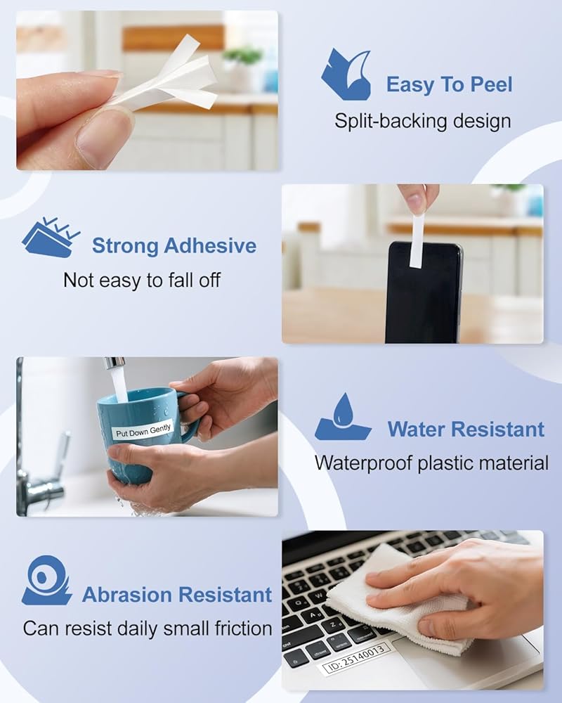 4 . Features: Split backing design, easy to install. Print clearly, matte surface and easy to read. No adhesive residues when the labels are removed.(Please clean the surface of the object before sticking.)