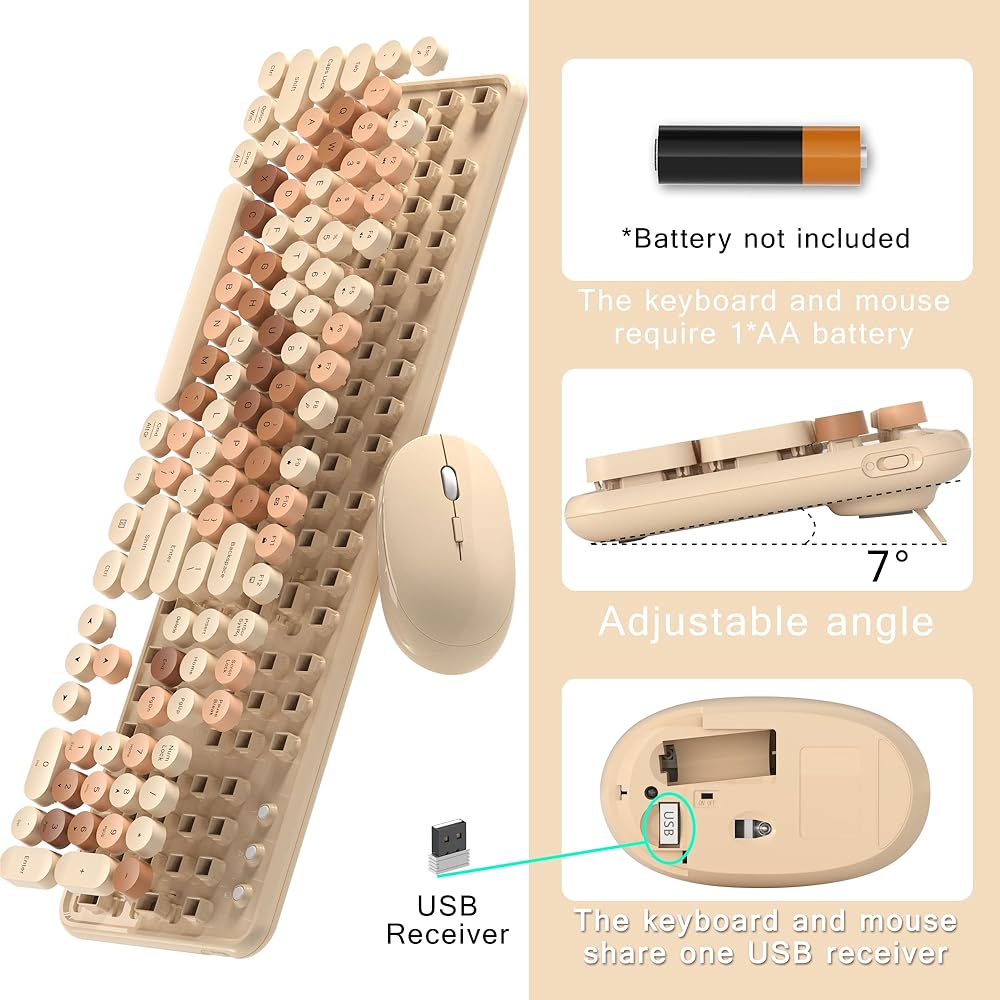 Colorful Wireless Computer Keyboard and Mouse Combo with Round Typewriter Keycaps, Retro Design, Power Switch, Ergonomic Design, 2.4GHz Wireless for Windows, Mac, PC(Milk-Tea Colorful)