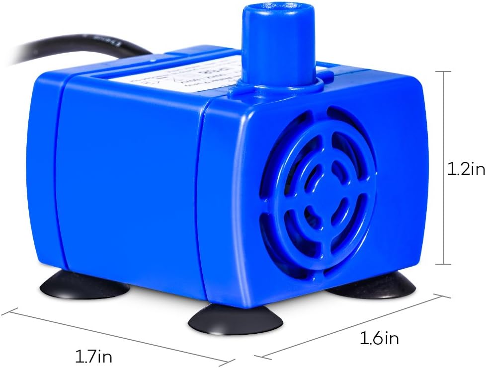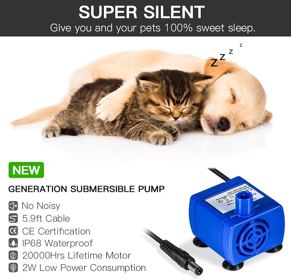 SUPER SILENT PET FOUNTAIN PUMP & LOW POWER CONSUMPTION: You cant hear the water with the silent submersible , quiet operation even work for long time; Low power consumption, only 1.5 degree a month for fresh pet waterer replacement pump.
