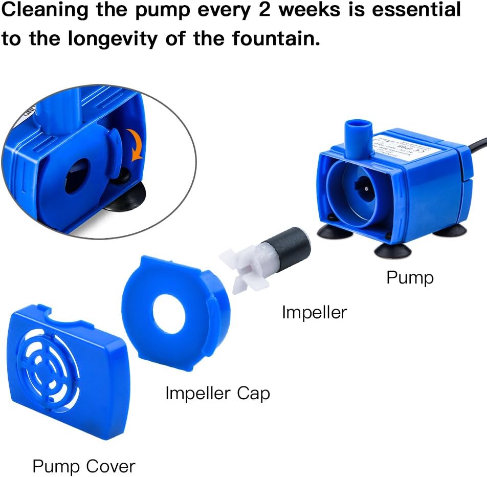 EASY to SWEEP: Sweeping the pump every 2 weeks is essential to the longevity of the fountain; First, remove the pump cover; Second, remove the impeller ; Third, remove the impeller and sweep the parts with soap and warm water for dr-160.