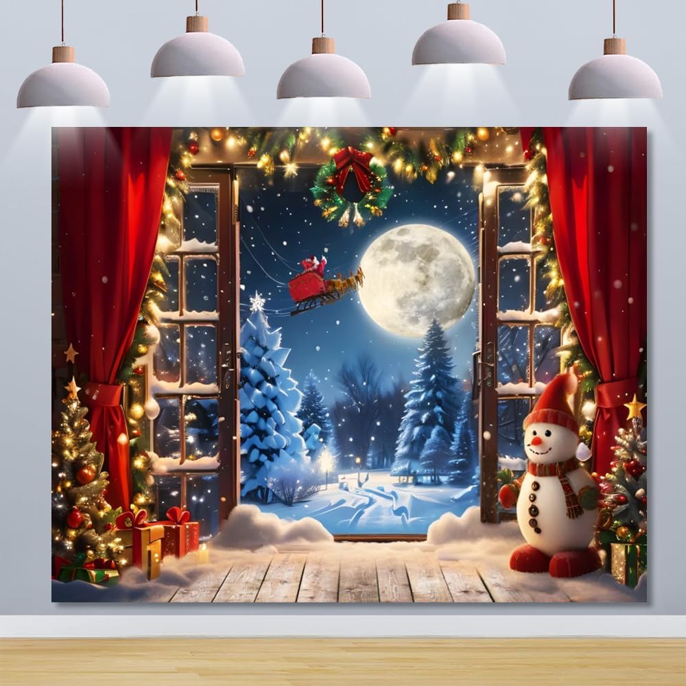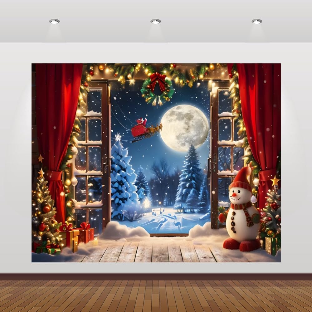 Christmas Backdrop 10x8ft Winter Window Forest Xmas Tree Santa Claus Moon Night Snowman Snow Snowflake Red Curtain Photography Background Merry Christmas Family Holiday Party Banner Decorations