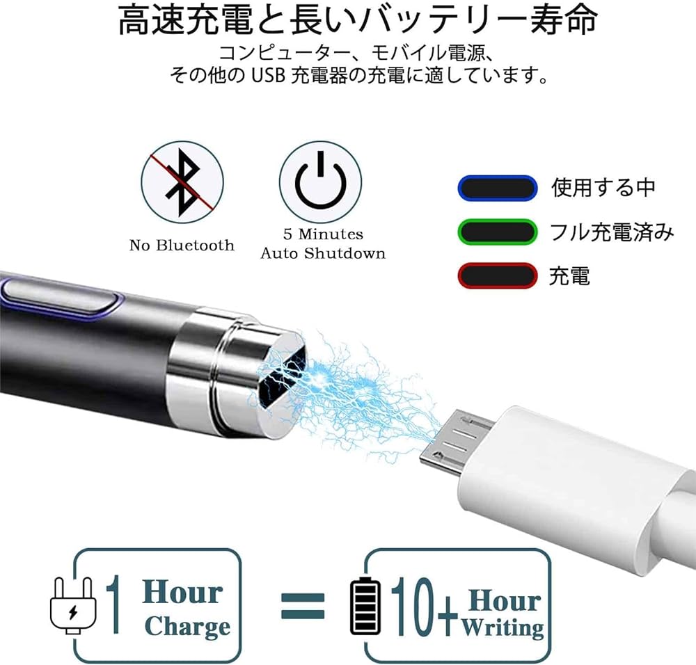 [Long Battery Life] - The stylus pen for android has a built-in rechargeable lithium battery that can be charged via Micro USB output. This iPhone stylus can be fully charged in 1 hour and can be used continuously for 10 hours. It will automatically shut down after 5 minutes of inactivity to save power.
