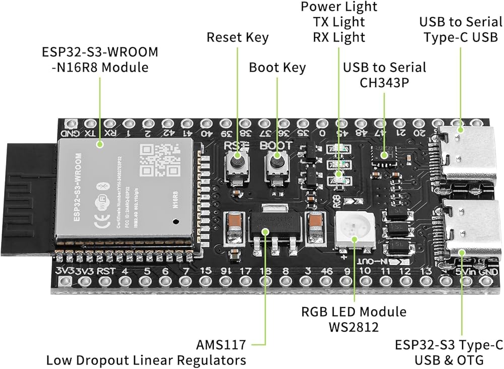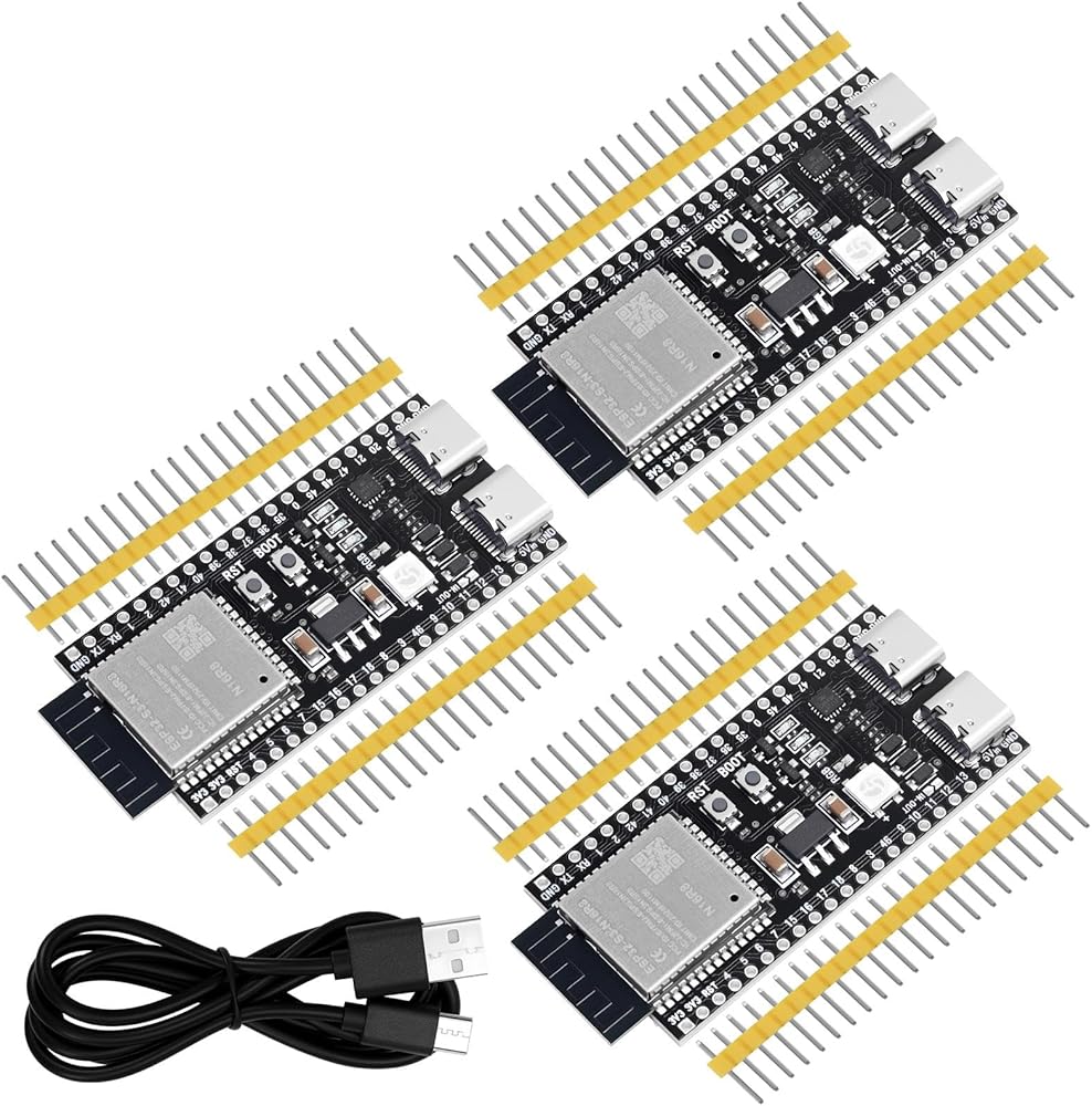3pcs ESP32-S3-DevKitC-1-N16R8 Development Board Integrated 2.4GHz WiFi Bluetooth 5.0 ESP32-S3-WROOM-1 Microcontroller Processor Dual Type C Interface for Arduino with 1pcs 1m Type-C Cable Set