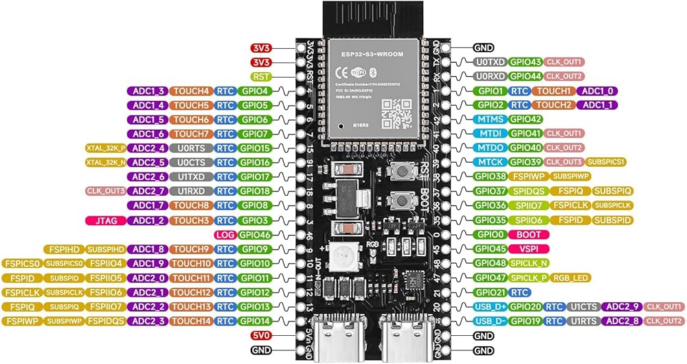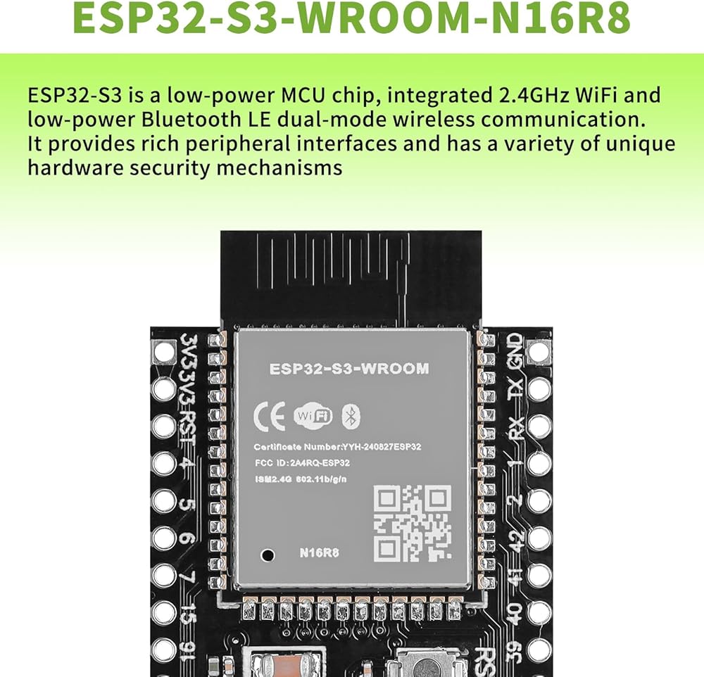 Powerful Performance: ESP32-S3 is an MCU chip integrating 2.4GHz WiFi and Bluetooth 5 (LE). It is equipped with LX7 dual-core processor, main frequency up to 240MHz, built-in 512 KB SRAM (TCM), 44 programmable GPIOs. pins and rich communication interfaces. Supports larger capacity high-speed Octal SPI Flash and off-chip RAM, and supports user configuration data cache and instruction cache