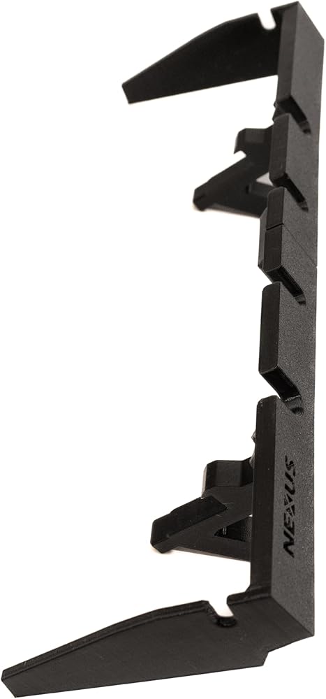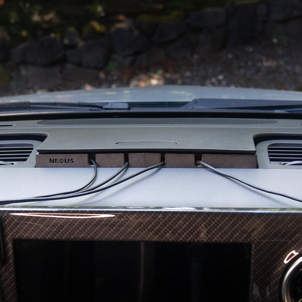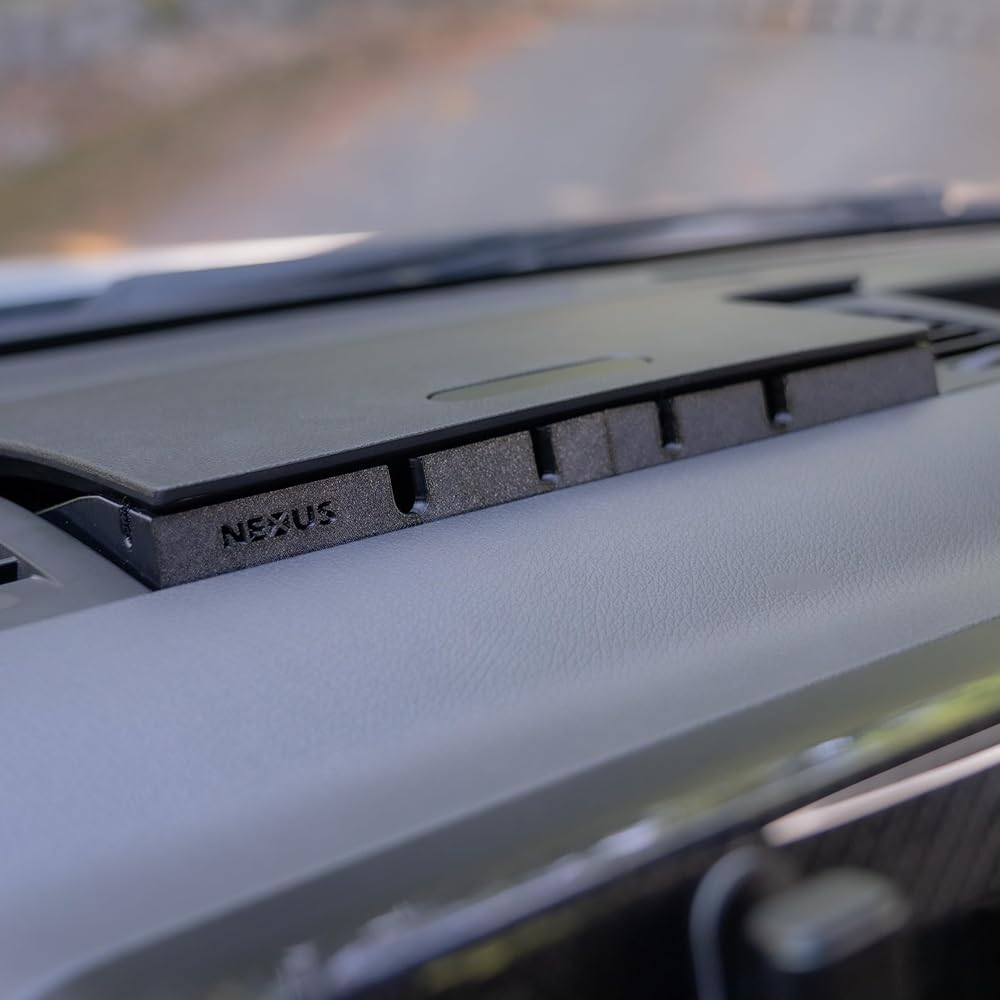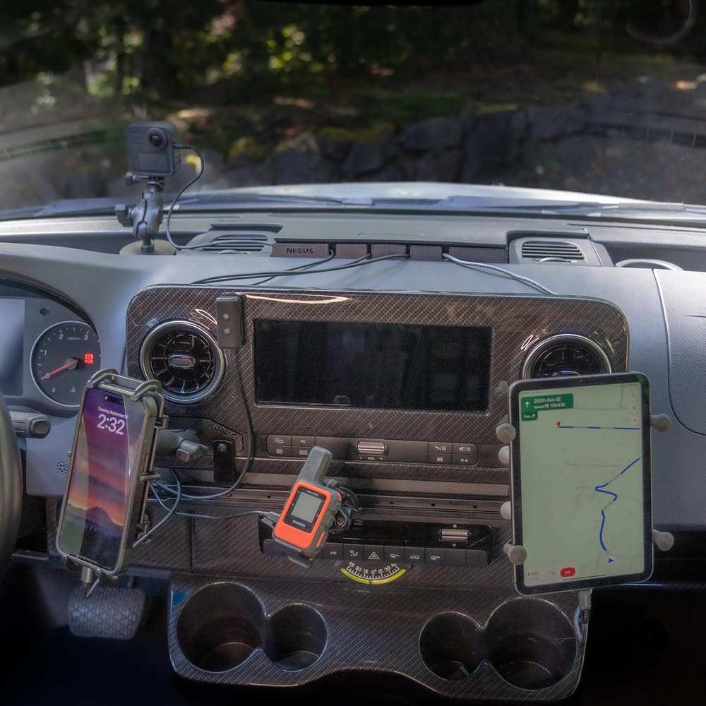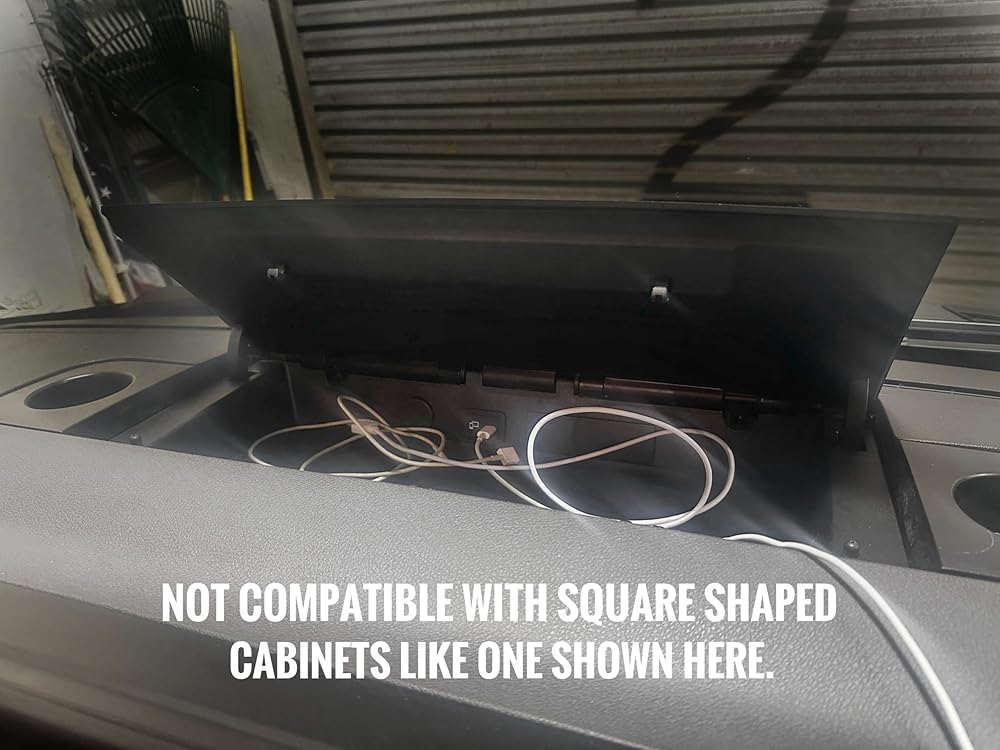 The NEXUS Cord Console allows you to feed cords from the dashboard charging cabinet to your devices mounted while driving such as smartphones, tablets, laptops, smartspeakers, GPS transceivers, radios, cameras and more. No more smashing the cabinet closed on delicate wires or trying to open the cabinet while driving to plug in your phone. The Cord Console installs in seconds by simply snapping in the legs in the pre-existing latch holes and is secure on the roughest 4x4 roads. The Console has 6 access ports, including side ports and 2 larger openings that can accomodate a full sized power cord. Perfect for use with the Alexa Echo Auto or other vehicle smartspeakers. Also a perfect companion to the NEXUS Dash Track, Cubby Adapter or Cup Adapter when used to mount your electronic devices. Made in USA with rugged polycarbonate for high temperature and UV resistance. Note: compatible with Sprinter Van charging cabinets shaped like the one displayed in product photos, but not compatible with square shaped cabinets, as shown in last image.