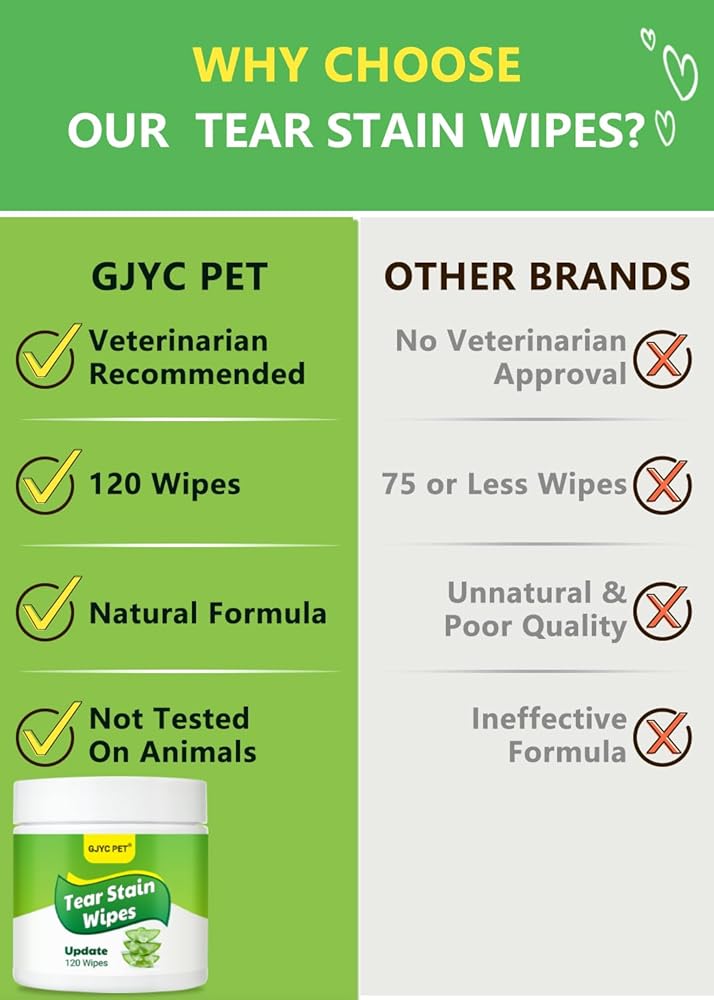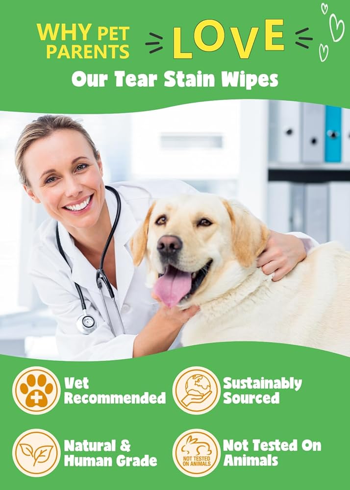 These Tear stain removal wipes for dogs and eye stain wipes for dogs are made with gentle, non-toxic ingredients that are safe for pets of all ages and breeds, including dogs and cats.
