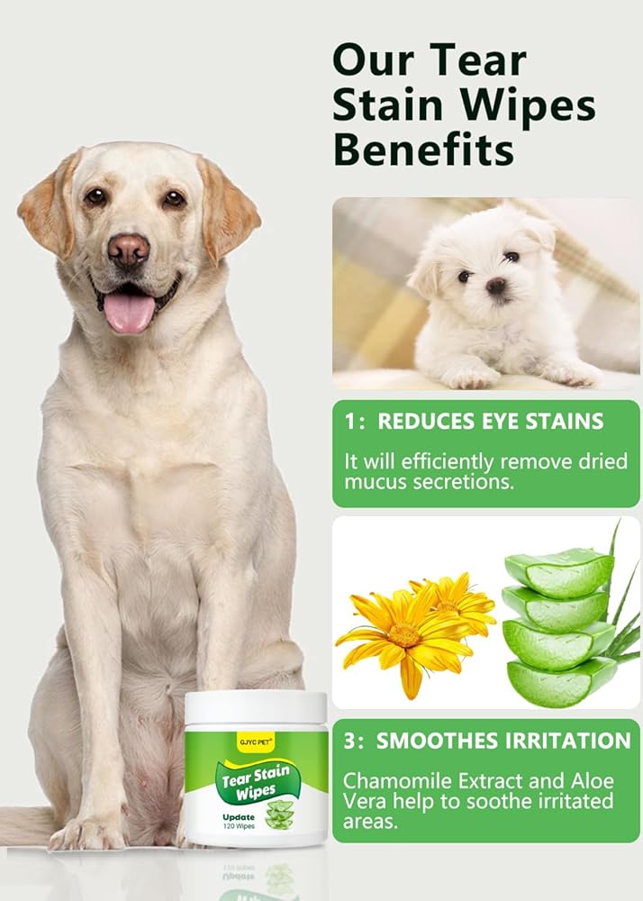Dog eye stain remover wipes and pet eye stain remover pads are designed to clean and remove tear stains, dirt, and other debris from the delicate area around your pet's eyes without causing irritation or discomfort.