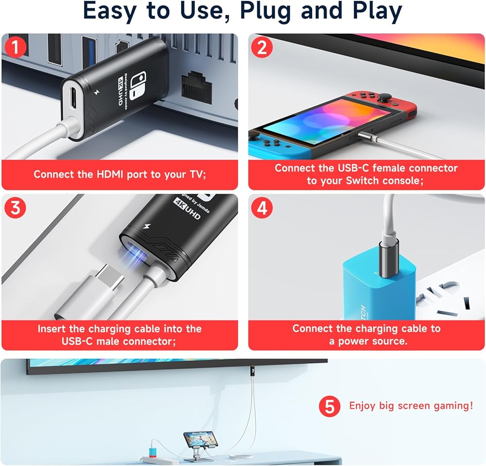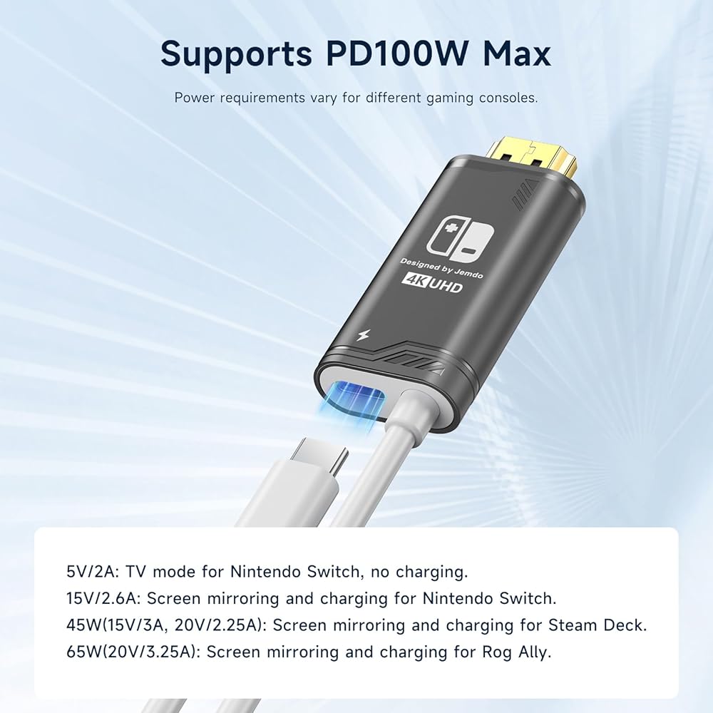 Featuring three ports – HDMI, PD fast charging, and USB C – our cable offers advanced versatility. The integrated PD fast charging port ensures uninterrupted gameplay by allowing you to charge your gaming console while screen mirroring. Plus, with a maximum power delivery of 100W, you can enjoy fast and efficient charging.