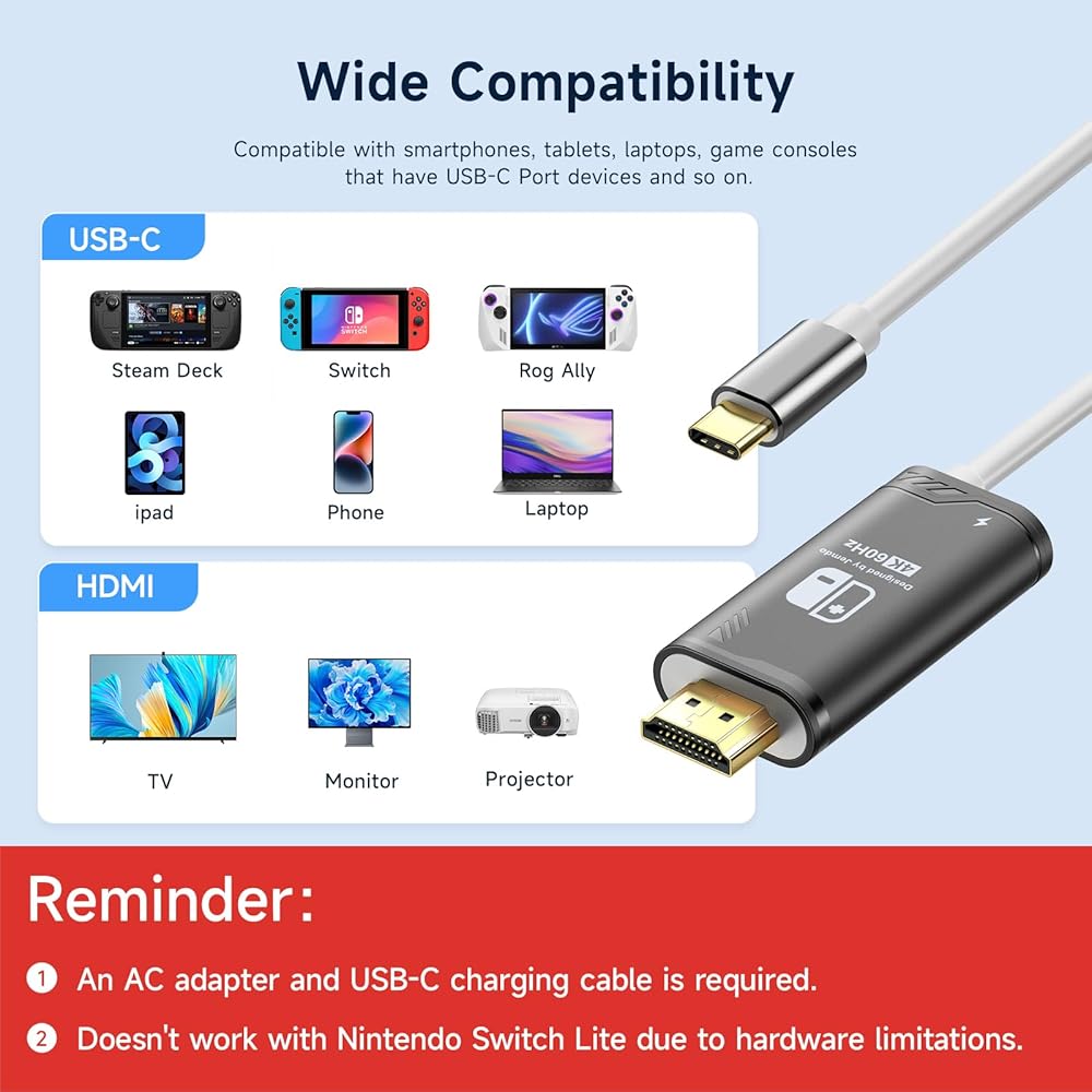 JEMDO 1.2m USB C to HDMI Cable Compatible with Nintendo Switch/OLED/Steam Deck/Rog Ally/Phone