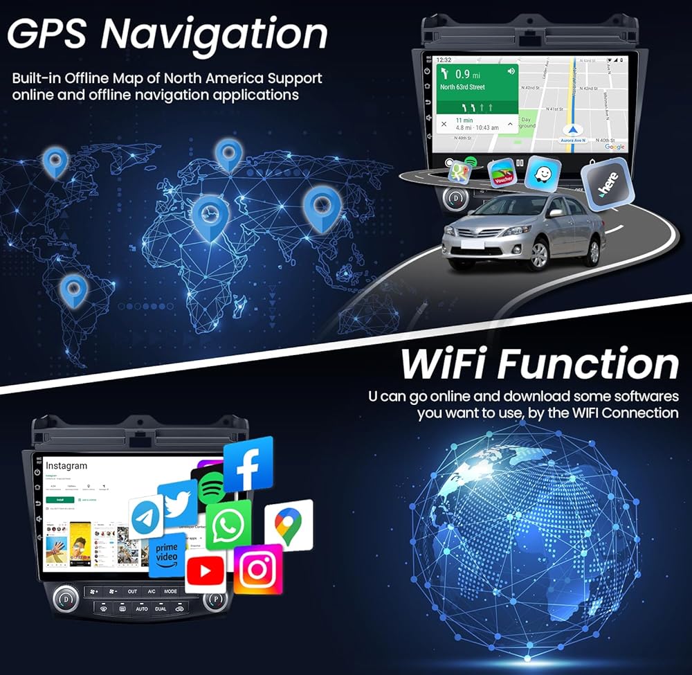 【Android 12.0 System & Built-in 5G WIFI & GPS】Upgrade Android 12.0 system for stronger compatibility; 5G network and 8-core chip greatly improves its running speed and graphics processing ability. What's more, a generous 64GB of ROM and built-in WIFI & GPS navigation making Honda accord radio have ample space to download and store all your favorite apps like Google Maps, Youtube,Soptify and etc.