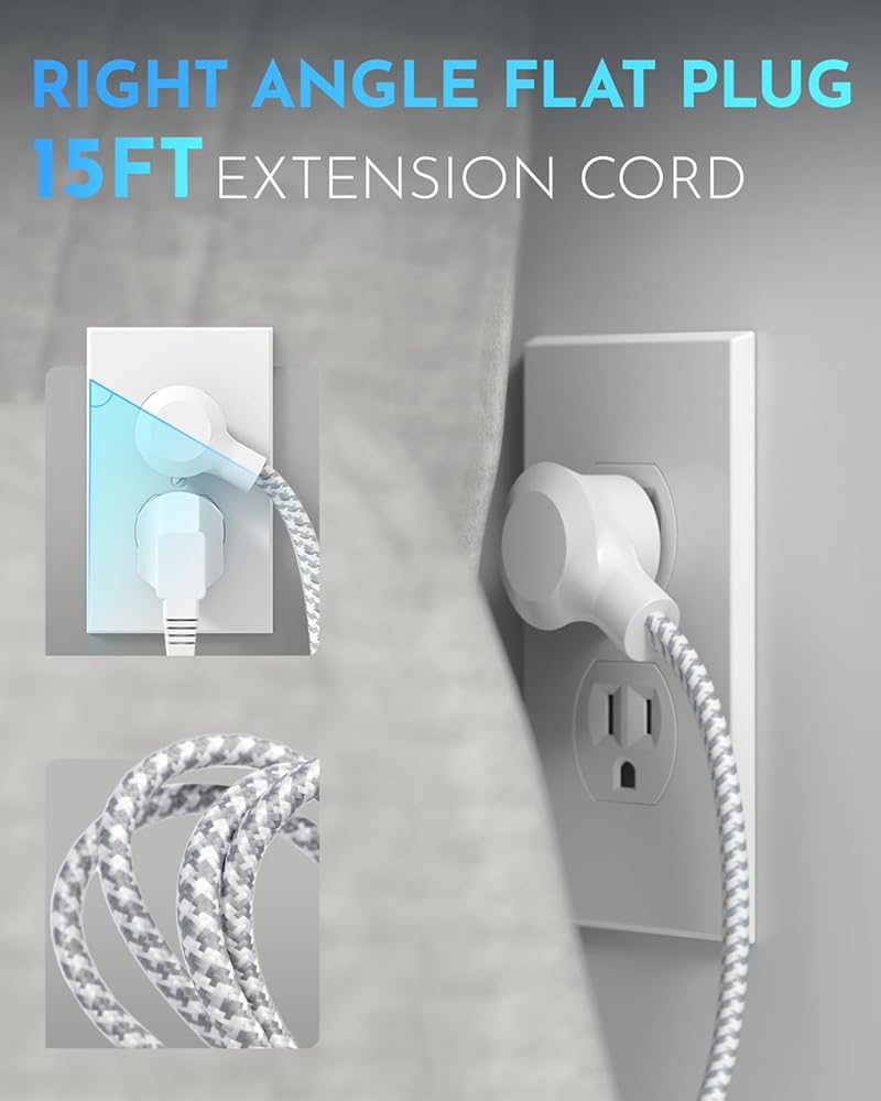 【15 FT Long Extension Cord】 This long power strip with 15ft is long enough to make it more flexible, flat plug design indoor extension cord with USB can fit easily in tight spaces, such as a desk, or nightstand; 45 degrees right-angle create enough room makes this usb power strip flat plug does not obstruct other plugs, suitable for installing behind sofa, wardrobe, bookshelves, and other furniture