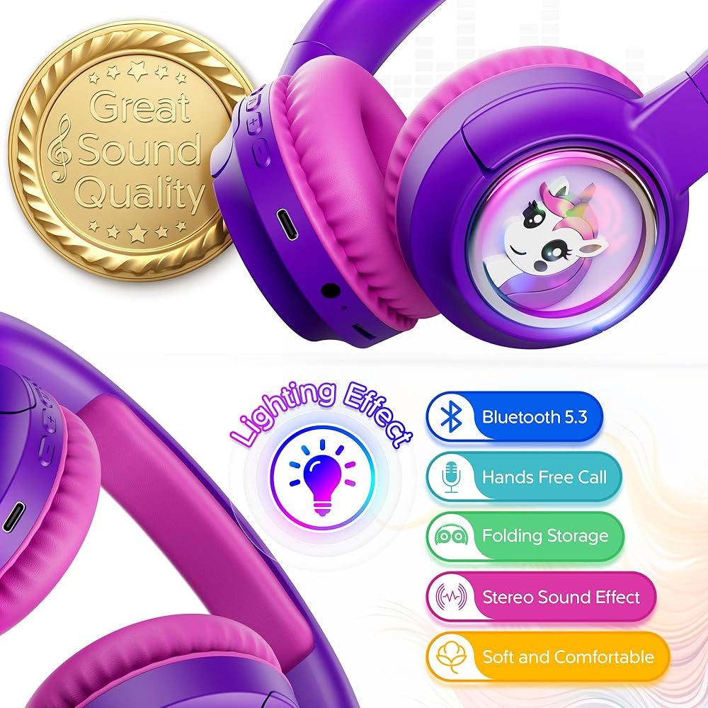 Our Contixo KB6 Wireless Bluetooth Headphones, the ultimate audio companion designed specifically for kids! Combining safety, comfort, and exceptional sound quality, these headphones are perfect for music, movies, and online learning. Equipped with advanced Bluetooth 5.3 technology, the KB6 ensures a stable and reliable wireless connection, allowing children to easily pair their headphones with smartphones, tablets, and laptops for uninterrupted entertainment. The large magnet full-range speakers provide immersive stereo sound, making every listening experience rich and engaging, whether your child is enjoying their favorite songs or watching animated shows. Safety is our priority, which is why these headphones feature a volume-limiting function that allows parents to manually adjust the maximum volume, protecting young ears from potential hearing damage. Designed for comfort, the KB6 headphones are lightweight and foldable, making them easy to carry in backpacks or travel bags. The adjustable headband ensures a snug fit for various head sizes, so kids can wear them comfortably for hours—ideal for long car rides or flights. Versatility is key; these headphones support not only Bluetooth playback but also a 3.5mm audio input, making them compatible with a wide range of devices. Your child can enjoy their favorite media wherever they are. Additionally, the KB6 features a built-in high-sensitivity microphone for hands-free calling, allowing seamless communication with family and friends. With a fun and vibrant design, complete with engaging lighting effects, these headphones are sure to become your child's favorite accessory. The large capacity lithium battery charges via Type-C in just two hours and provides up to 12 hours of continuous playtime, ensuring endless entertainment without frequent interruptions. Choose the Contixo KB6 Wireless Bluetooth Headphones for a perfect blend of safety, comfort, and fun—your child will love every moment spent with them!