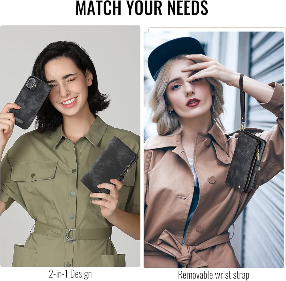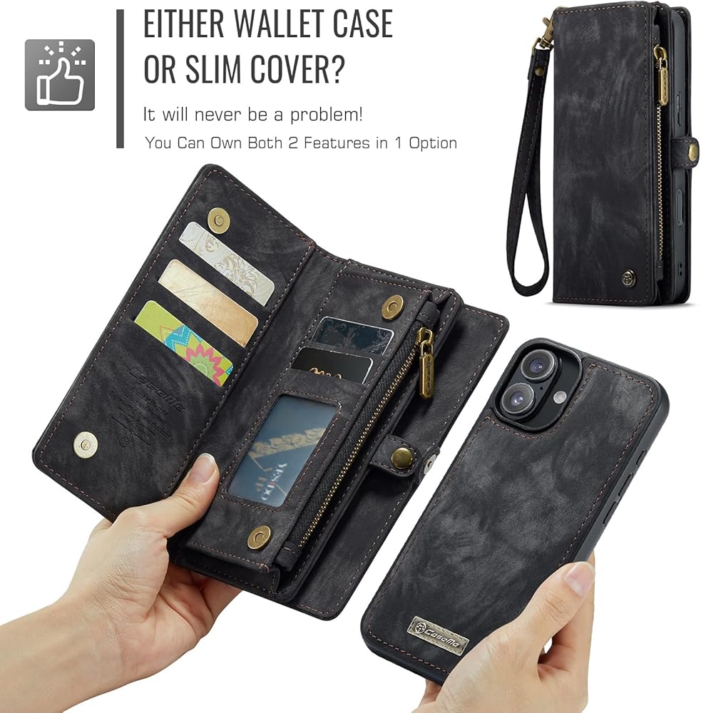 【Fashion Wallet 】Wallet Case for iPhone 16 Plus Design and phone case 2-in-1 Removeable Style, The Wallet with 8 card slot, 1 zipper closure coin pocket, 1 mobile phone cover, Luxury leather wallet case from Zipper closure ensures all your cards, money and personal staffs stay inside securely.