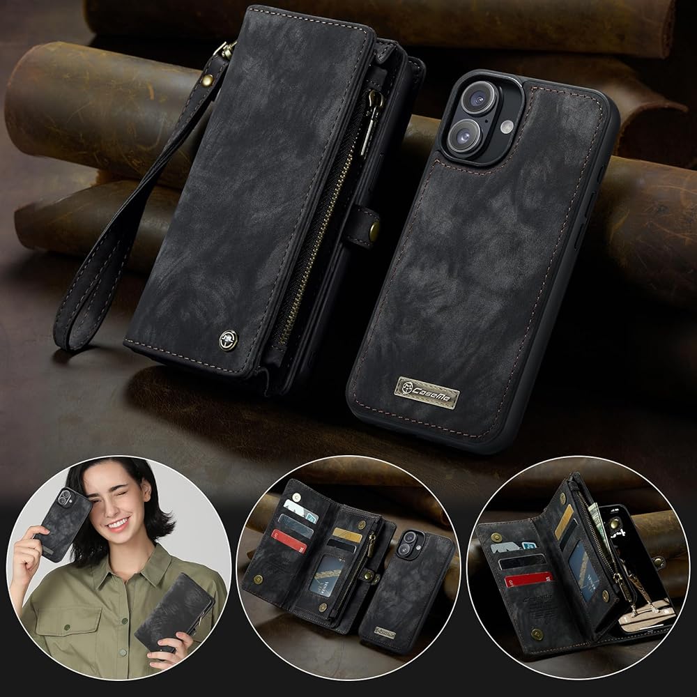 Kowauri Wallet Case for iPhone 16 Plus, Zipper Purse Folio Leather Wallet with Card Holder Wrist Strap Detachable Magnetic Shockproof Protective Back Case for iPhone 16 Plus 6.7 inch (Black)