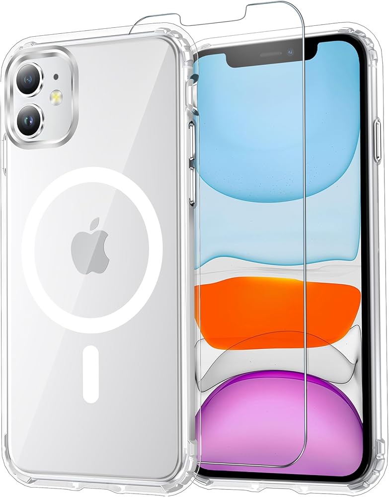 Temdan for iPhone 11 Case Clear with Screen Protector, Compatible with Magsafe, Anti-Yellowing, Military-Grade Protection, Shockproof Slim Magnetic Phone Case Cover, Transparent