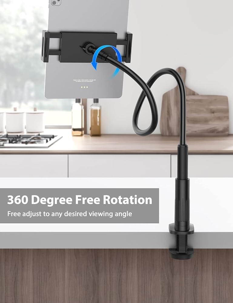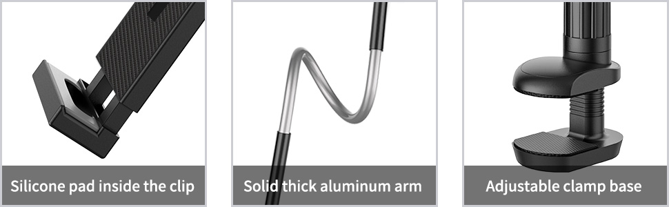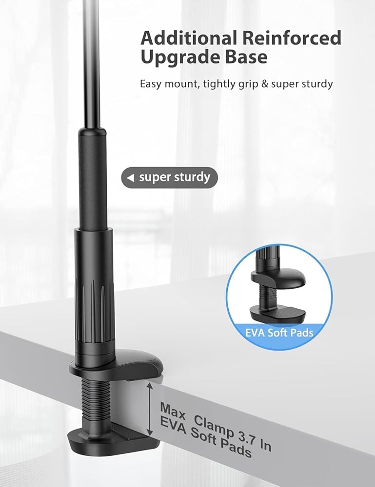 【Additional Reinforced Upgrade Base】Reinforced and thickened base, not easy to break. Non-slip silicone pads are added to the base clip to avoid damage to your furniture. The base has a maximum clamp size of 3.7 inches, maximizing usability. Whether you're laying in bed watching movie, viewing recipes in the kitchen,exercising in the gym, or using your devices anywhere, you don't have to worry about falling and breaking it