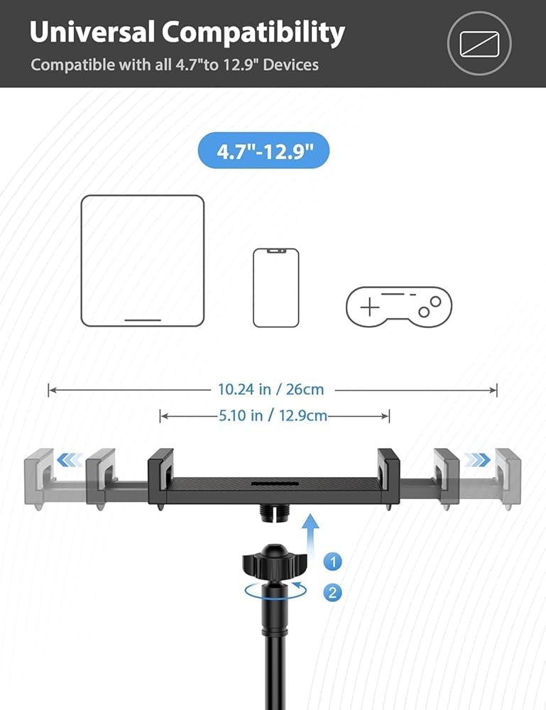 【Universal Compatibility】Acuvar tablet holder has a wide range of compatibility, suitable for almost all 4.7-11 inch devices on the market, such as iPad mini 2 3 4 5,iPad Pro 9.7 10.5 11 , iPad Air 2 3 4, Galaxy tabs, Switch, Fire HD tab , iPhone 13 /pro Max /Pro/X/11 10 8 7 6 , Samsung Galaxy Tab 10.1" 10.5" 9.7" 9.6" 8", Kindle Fire HD 7 8 10 , ect. In addition, the tablet phone is equipped with silicone pads, which will protect your device from scratch and damage