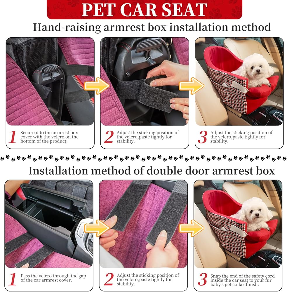 【تحسين الأمان】يوجد مشبك أمان مضاد للهروب داخل مقعد الحيوانات الأليفة، والذي يستخدم لإصلاح طوق الحيوان الأليف لمنعه من التجول في السيارة والتسبب في التداخل مع القيادة. نحن نعتمد طريقة تثبيت مقعد الحيوانات الأليفة على المقعد. صندوق مسند للذراعين من الفيلكرو. يمكنك ضبط موضع الالتصاق لصندوق مسند الذراع وفقًا لحجم صندوق مسند الذراع في سيارتك والتأكد من لصقه بإحكام. وقد قمنا بتصميم غير قابل للانزلاق في الجزء السفلي من المقعد لزيادة الاحتكاك.
