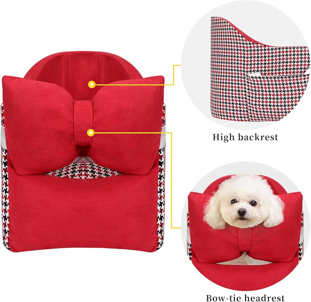 مقعد سيارة معزز للحيوانات الأليفة للكلاب الصغيرة أو القطط، مسند ذراع بوحدة التحكم المركزية قابل للإزالة والغسل، مقعد سيارة للكلاب مع وسادة ناعمة على شكل فيونكة (أحمر)