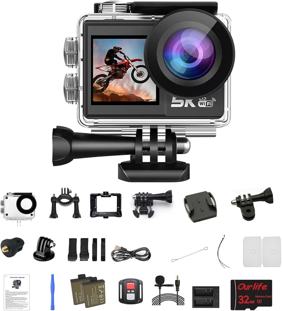Ourlife 5K Action Camera, Waterproof Sport Camera with Dual Screen,Anti-Shake WiFi Video Camera 5K/30FPS 4K/30 60FPS 720P Adjustable, with 32GB SD Card, 2 Batterie, Dual Slot Charging Dock