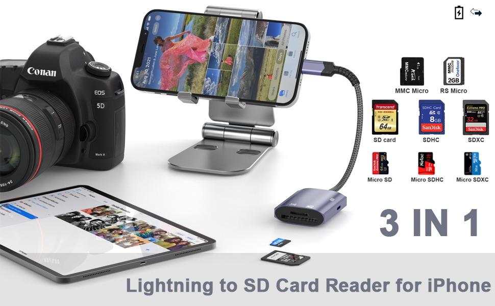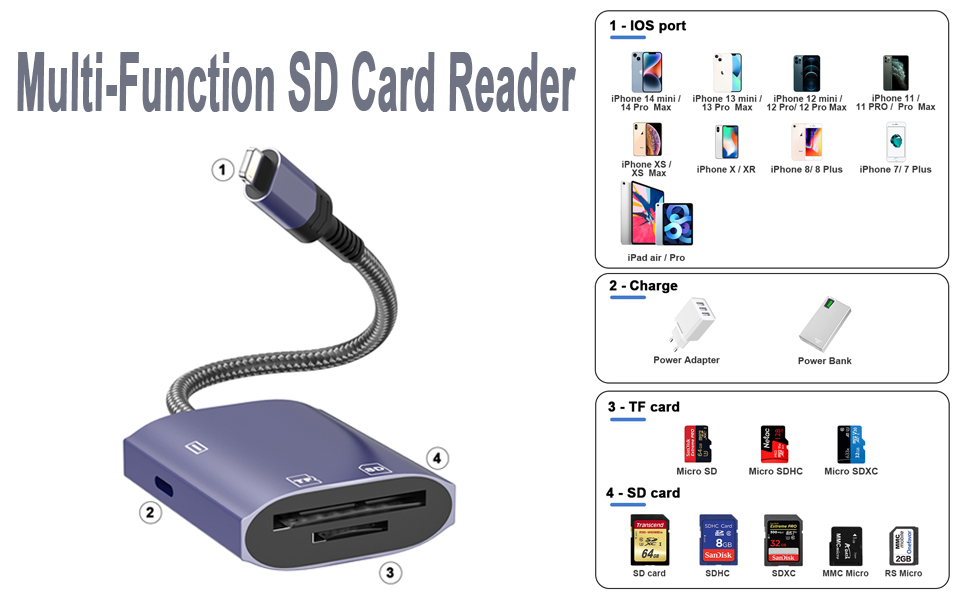 💯【EXTENSIVE COMPATIBILITY,NO DRIVER REQUIRED】: The camera memory card reader is compatible with iPhone 14/14 Pro/13/12/Xs/Xs Max/X/8/8 Plus/7/7Plus/SE and iPad Air/Mini/Pro. Support SD, SDHC, SDXC, MMC Micro, RS MMC, Micro SD, Micro SDHC, Micro SDXC in UHS-I mode.