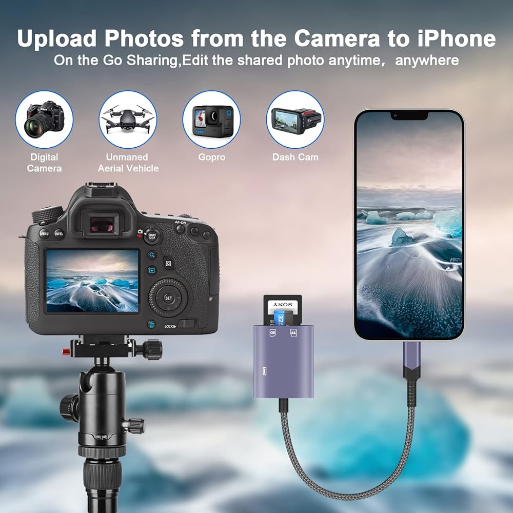💯【FAST CHARGING AND HIGH SPEED TRANSMISSION】: This SD/TF 3-in-1 card reader with dual slots allows you to read and write two cards at the same time, and supports up to 2TB of card capacity. The card reader provides you with ultra-high speed data transmission and additional charging ports, 10 times faster than USB 2.0. It can also charge iPhone while synchronizing data, ensuring long-term stability. There is no need to worry that your phone is low battery.