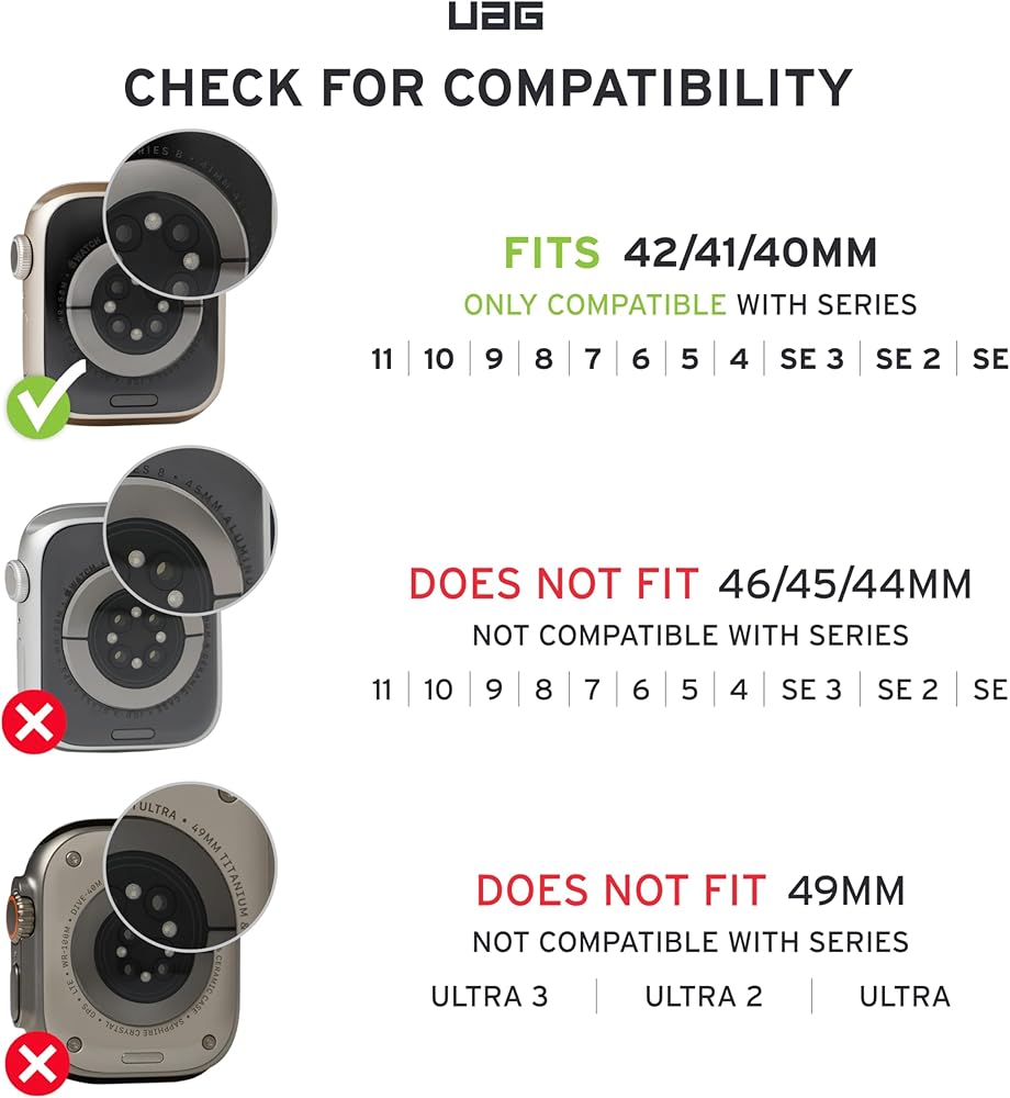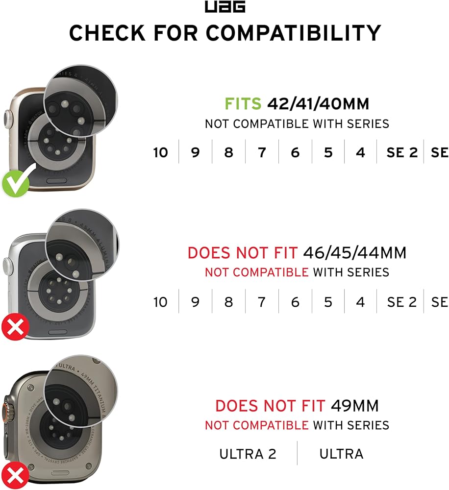 COMPATIBLE MODEL: Designed to fit Apple Watch Series Ultra 2, Ultra, 9, 8, 7, 6, 5, 4, SE 2 & SE; Watch Sizes: 49mm/46mm/45mm/44mm. Fits min wrist size 100mm, fits max wrist size 190mm. Packaging Note: OLDER PACKAGING does not state compatibility for the Apple Watch Series 10. This product IS compatible with Apple Watch Series Ultra 2, Ultra, 10, 9, 8, 7, 6, 5, 4, SE 2 and SE.