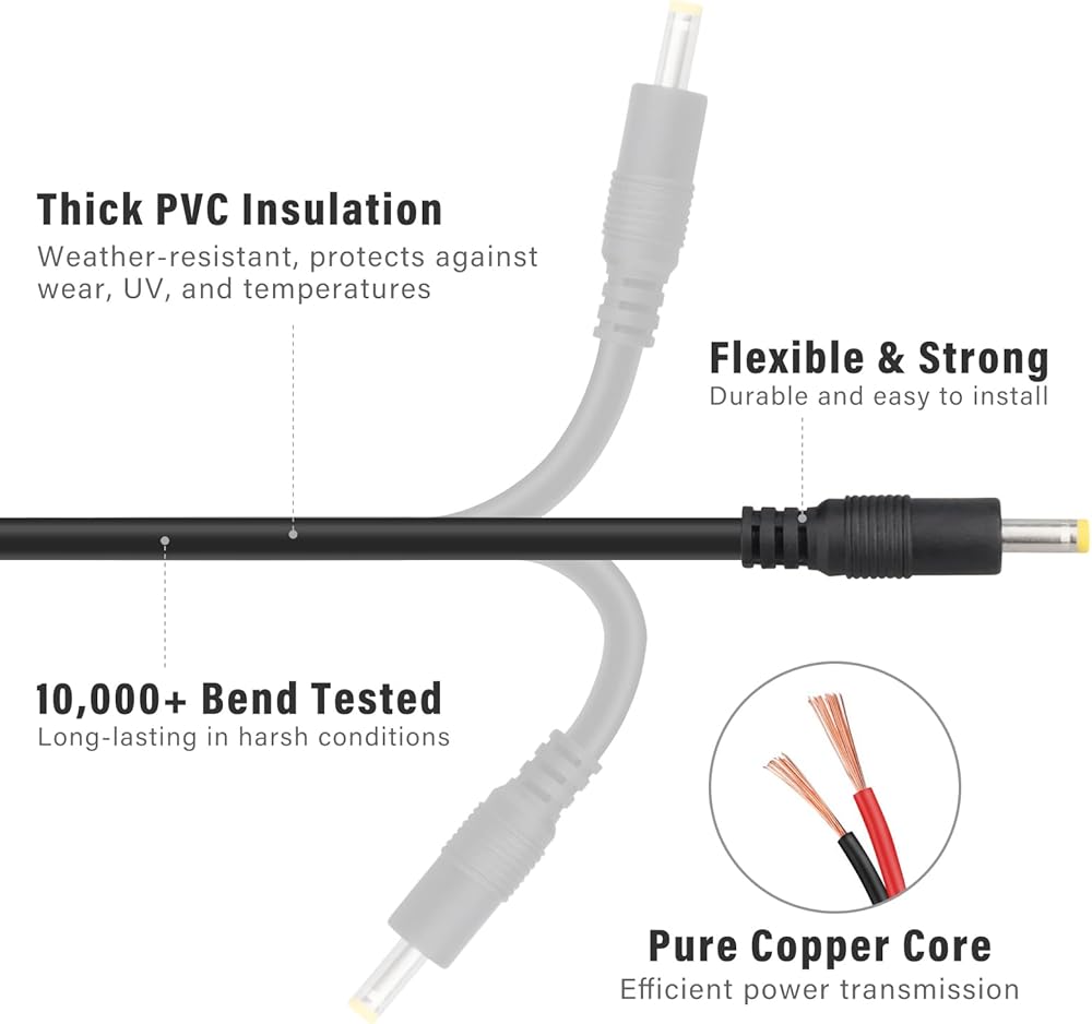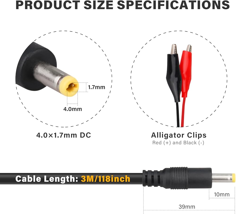 The plug size is 4.0 mm OD x 1.7 mm ID, with a length of 118" (3M), featuring heavy-duty 18 AWG wire, and is weather-resistant for outdoor security, protecting against wear, UV, and temperature.