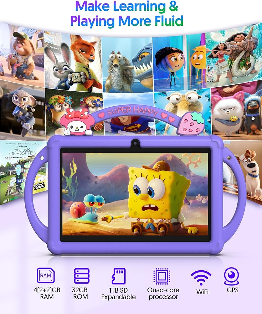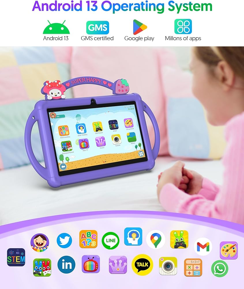 NEW ANDROID 13 KIDS TABLET - This Kids tablets android is equipped with the latest Android 13. Powerful quad-core processor. Run smoother when open apps and loading the pages. 4GB RAM(2+2 expansion) and 32GB ROM and Supports Micro SD card expand up to 1TB. so that you can storage more photos and videos. Tablet passed the GMS certification,you can download thousands of apps, such as, Netflix, YouTube, Skype, and more popular apps.Let your child explore games, media, e-books, drawing, and note-taking for an engaging learning experience