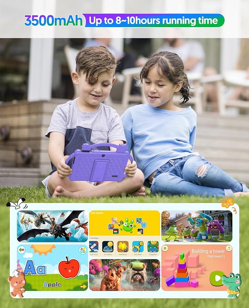 7 INCH TABLET FOR KIDS AND 3500MAH BATTERY UPGRADE - 7 inch baby tablet with quality 1024x600 IPS HD display screen. clear and bright screen provides outstanding visual experience when kids reading and watching the videos. The upgraded 3500mAh lithium battery and low-power CPU design ensure you enjoy 5-10 hours of reading, watching TV shows, surfing the web, and game playing, suitable for long-distance flights or road trips.Dual Speaker, 0.3MP+2MP dual camera, GPS, Wifi, Bluetooth, 3.5mm headphone jack