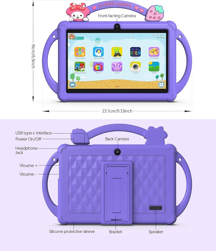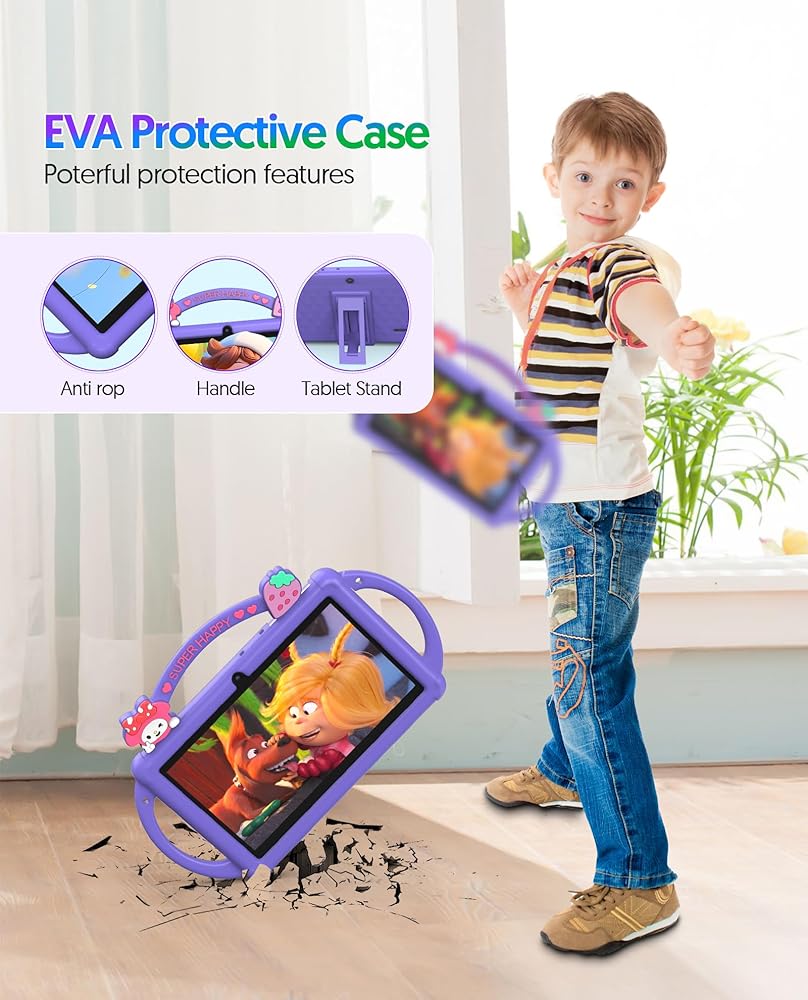 KIDS ANDROID TABLET WITH STANDABLE CASE - The silicone case is specially designed for kids, protecting the toddler tablet from scratches and bumps, drops, etc. Side handles for easy grip, the 7 inch tablet case that can stand, so kids don't need to hold the tablet all the time while learning, watching and playing. This tablet PC can bring a lot of fun and knowledge for your kids. learning while playing