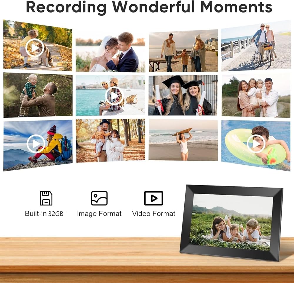 IPS HD Display & Personalized Settings: With 10.1 inch 1280*800 IPS HD touchscreen, digital picture frame brings out photo details from every angle, offering an incredible visual treat. Using the electronic photo frame's touchscreen, you can easily tweak settings like slideshow order, interval timing, image hiding, caption display, and sleep mode to match your photo viewing style